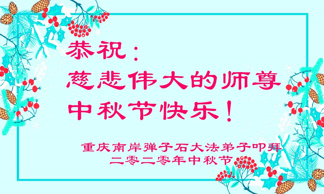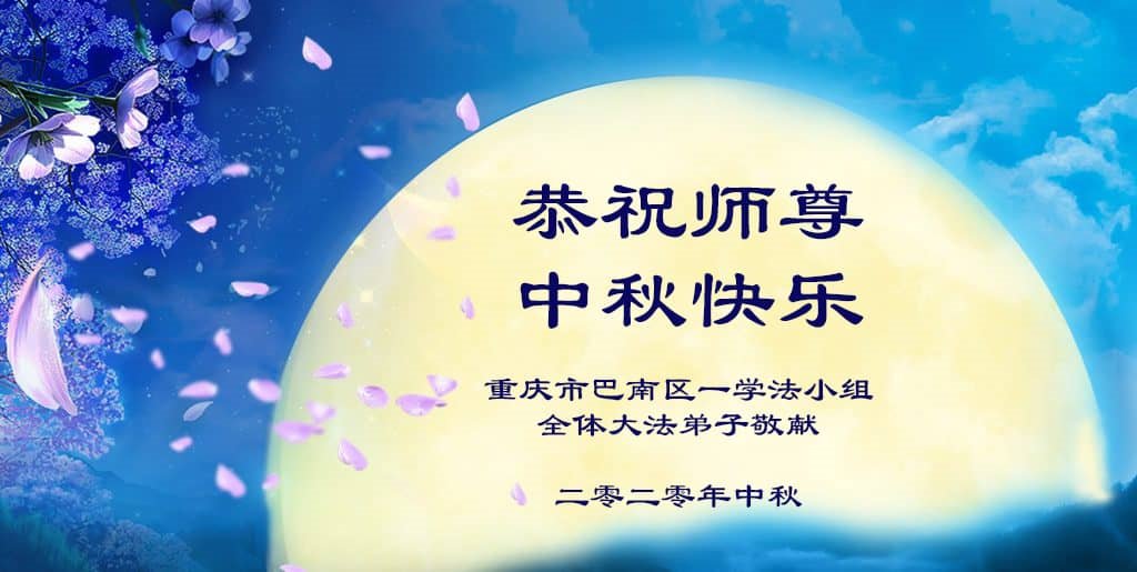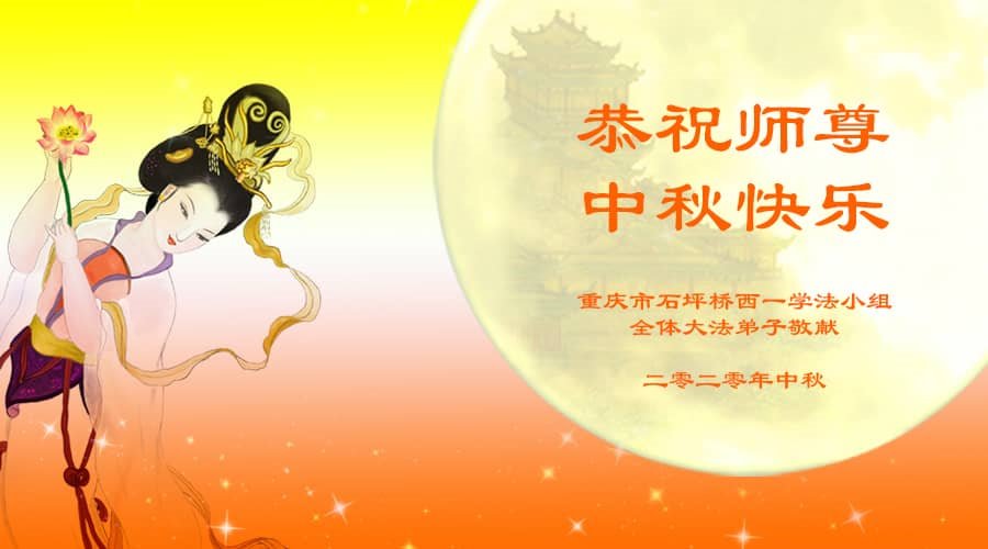 中秋佳節就要到了,重慶市石坪橋西一學法小組全體大法弟子恭祝師尊中秋快樂!我們雖然得法較晚,但在修煉路上,我們會不畏艱辛,精進實修,做三件事,讓更多人明白真相,得到救度。因為修了大法,我們感到很幸福,謝謝師尊選擇了我們,讓我們成為大法弟子。謝謝師尊!
