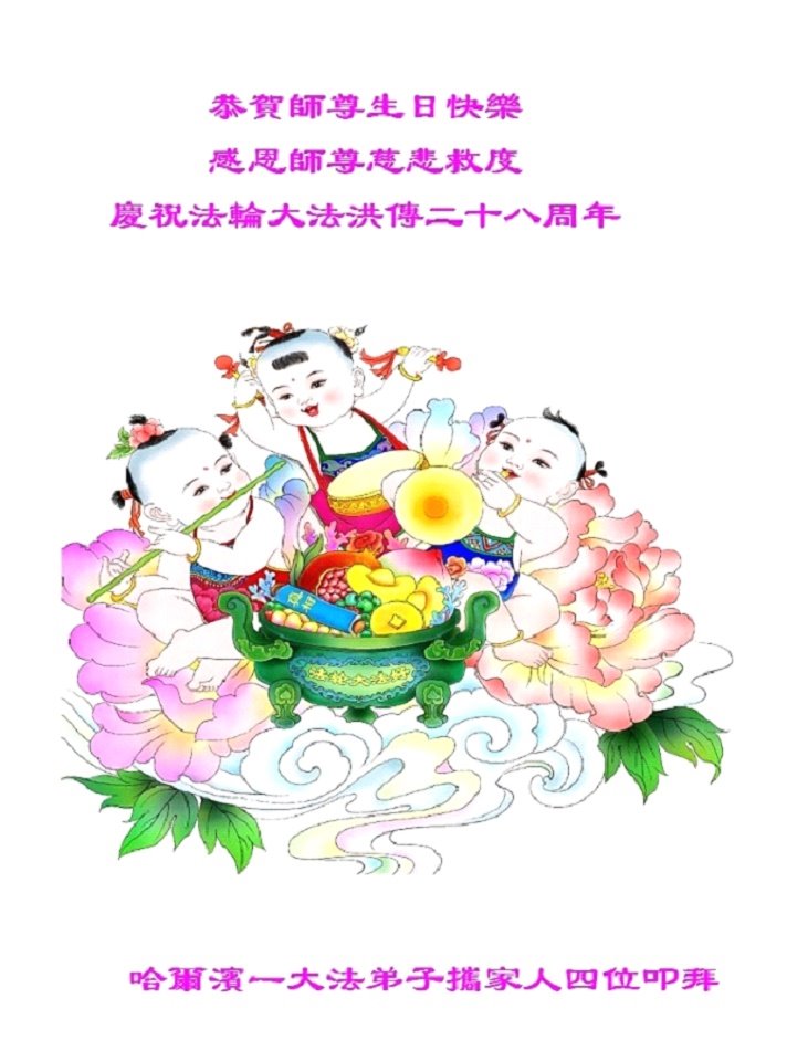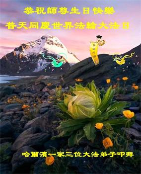 黑龍江哈爾濱市一家三口大法弟子恭祝師父華誕!