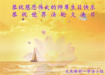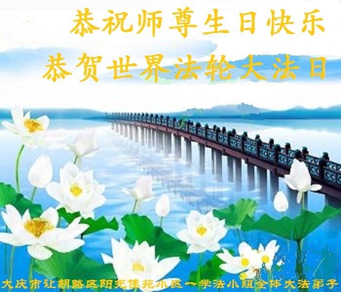 黑龍江省大慶市讓胡路區陽光佳苑一學法小組大法弟子恭賀世界法輪大法日!