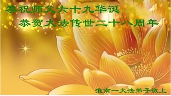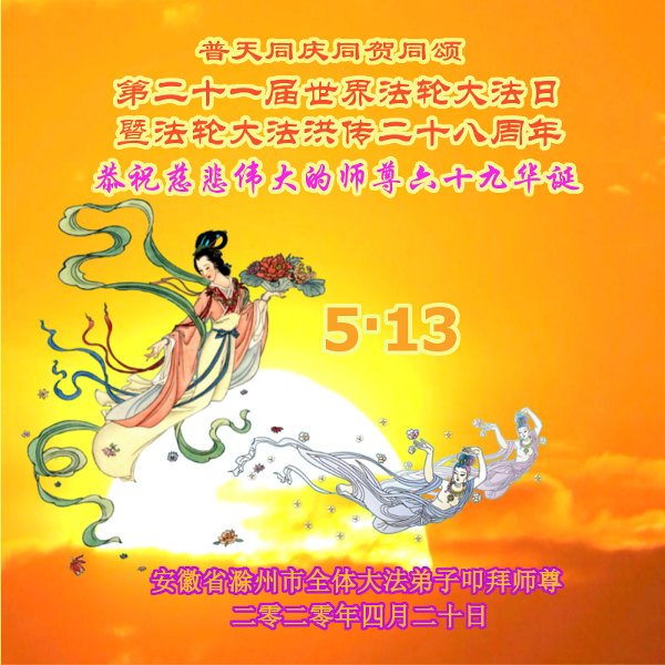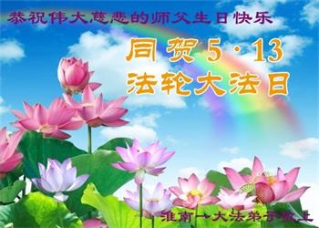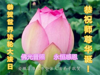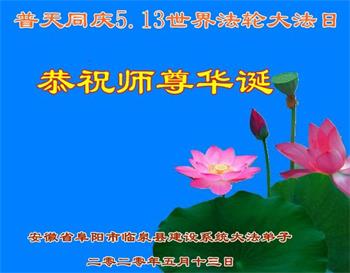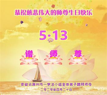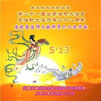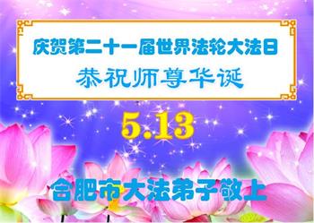在第二十一屆5.13世界法輪大法日即將到來之際,合肥市大法弟子恭祝慈悲偉大的師尊生日快樂!普天同慶法輪大法日!合肥市大法弟子感謝師父慈悲救度!今後,我們要在學法用心上多下工夫,學法還要得法,要理解法,記住法,還要運用法,證實法。做好三件事,修好自己,努力完成救度眾生的使命,不辜負師父的慈悲苦度。