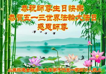 謝謝慈悲偉大的師尊!我們全家人恭祝世界法輪大法日!恭祝師尊生日快樂!