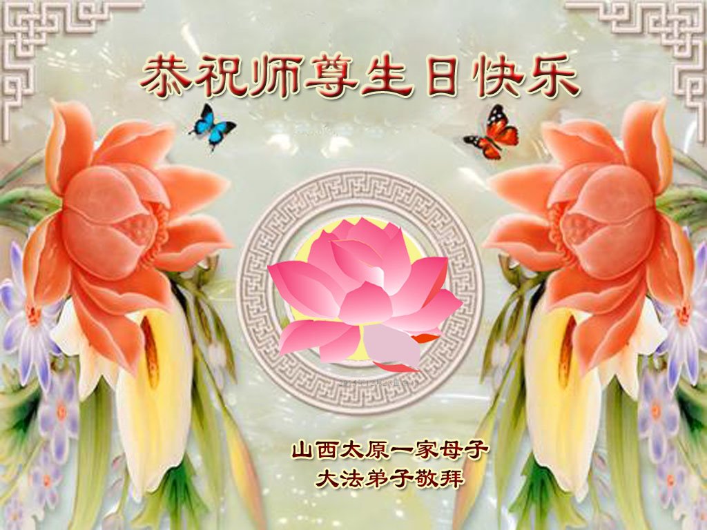 山西省太原市一母子大法弟子恭祝師尊生日快樂!
