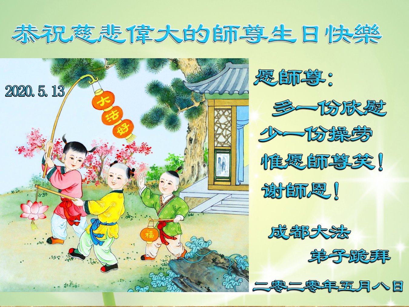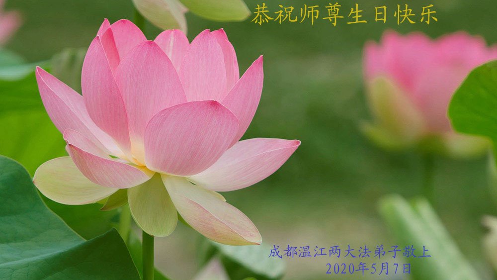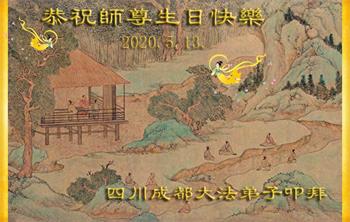 弟子們想念師父!感恩師父的慈悲苦度,至此佳節:四川簡陽全體大法弟子恭祝師尊生日快樂!