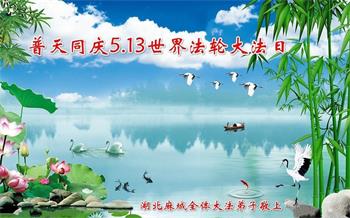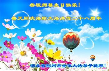 一年一度的世界法輪大法日要到了,我們黑龍江省大慶市八百垧地區的全體大法弟子向偉大的師尊致以深深的感恩!感恩師尊的慈悲苦度!我們作為大法弟子,一定做好助師正法、救度眾生的事,完成史前大願。特別是現在武漢肺炎(新冠病毒)大流行,給弟子救度眾生帶來了很大的難度。但是不管怎樣都干擾不了我們助師正法、證實大法、救度眾生的信心與決心。理智的去做我們應該做的事情,請師尊放心!叩拜師尊!