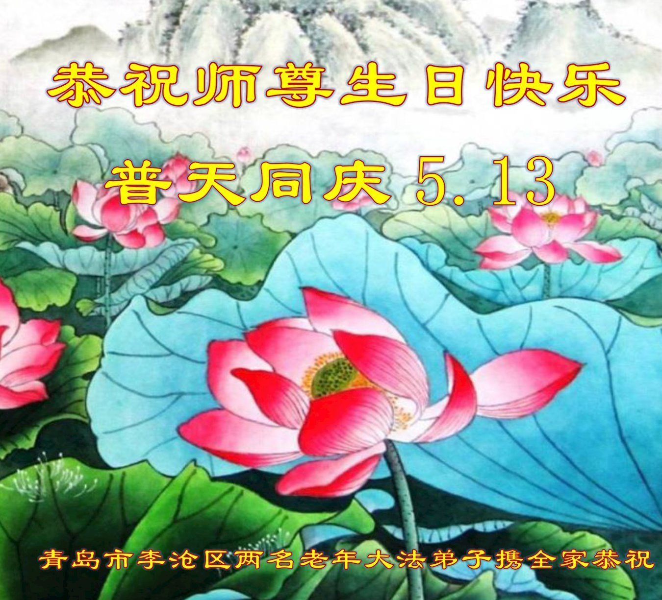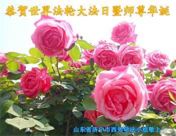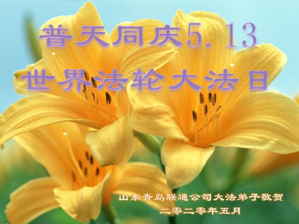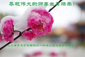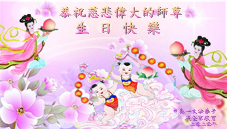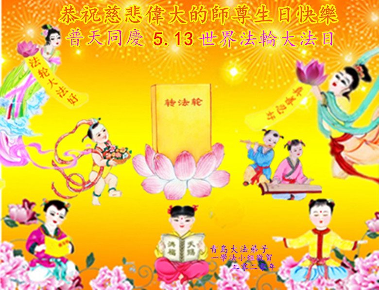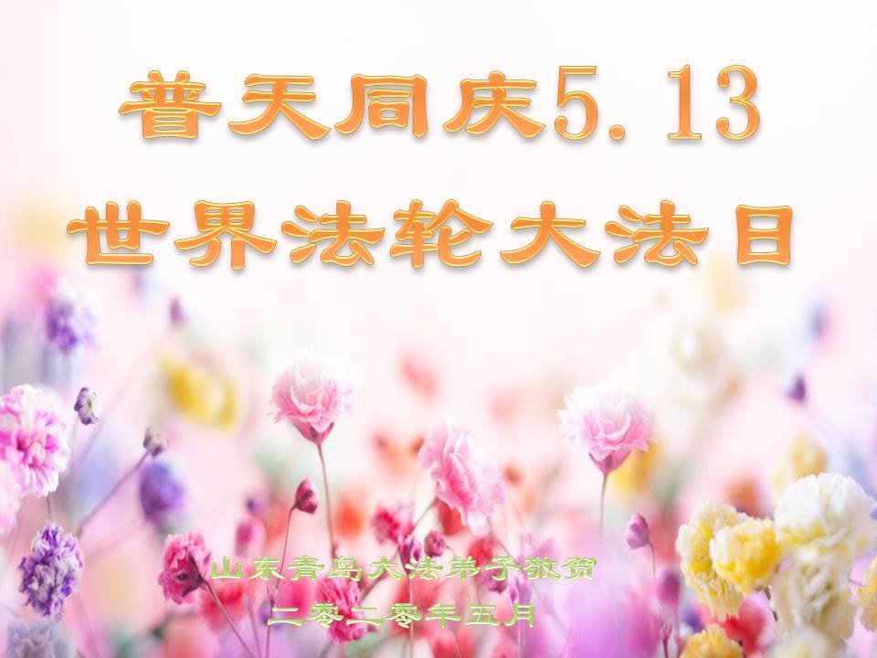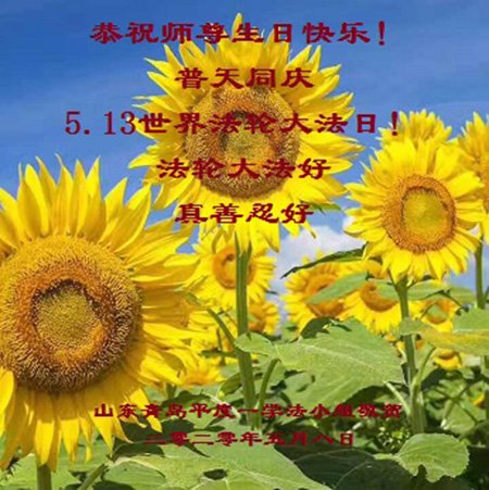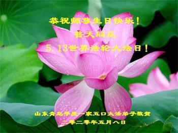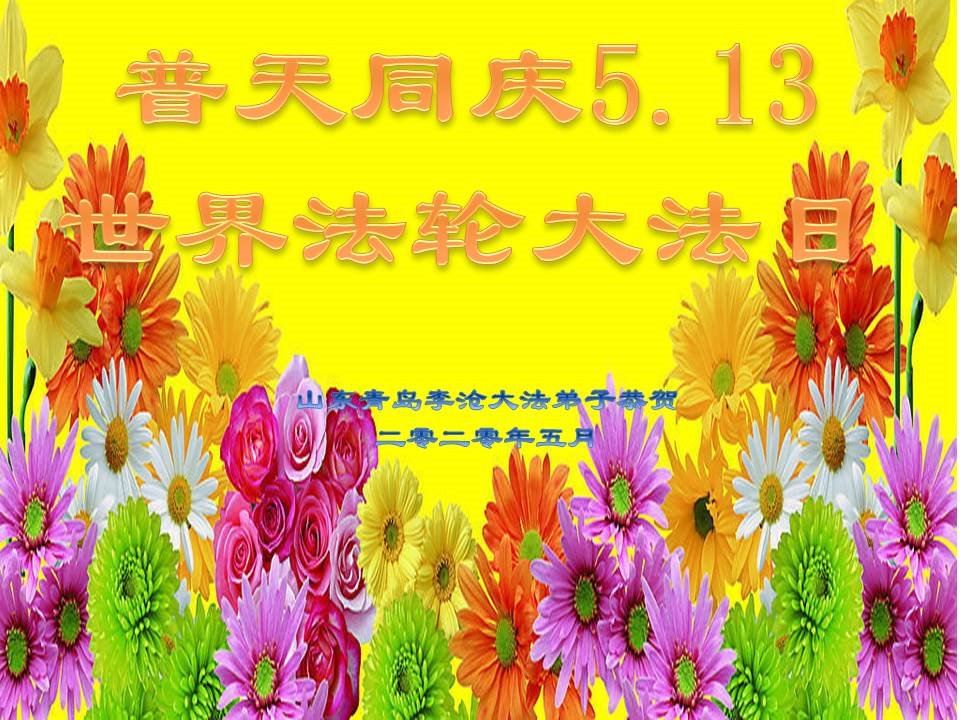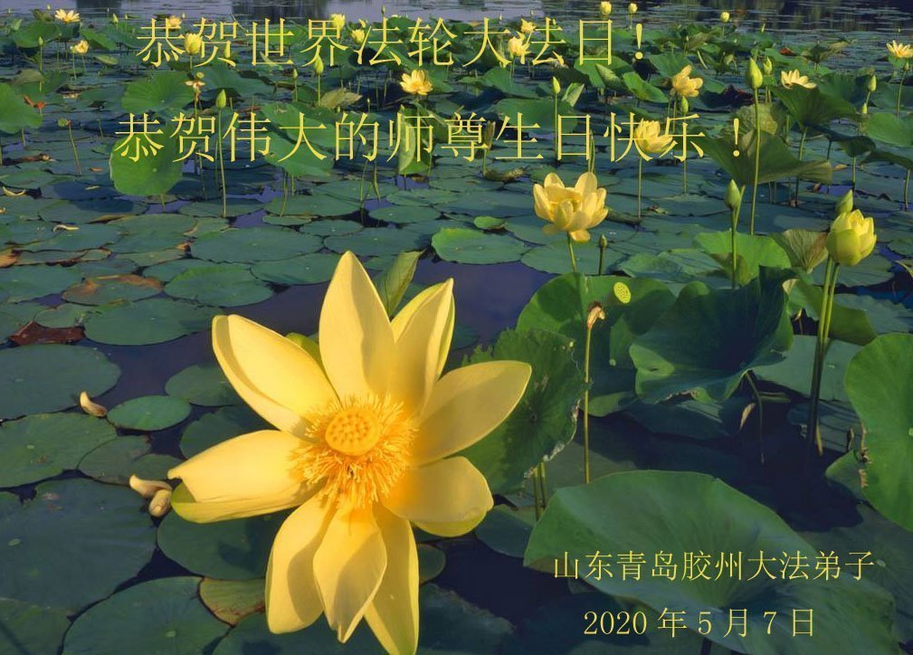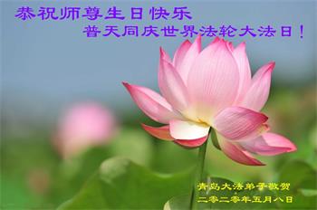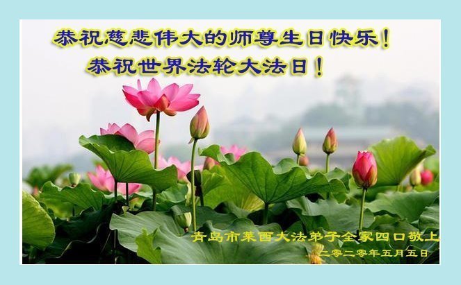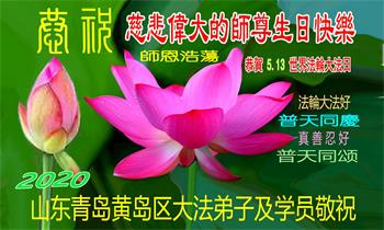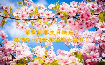 慈悲偉大的師尊好!在五一三法輪大法日這個普天同慶的大喜的日子即將到來之時,也同時迎來了偉大的師尊華誕。我們青島市黃島全體大法弟子懷著無比感恩的心情,衷心的感謝偉大的師尊的慈悲救度!並誠心向師尊問好!道一聲師尊辛苦了!謝謝師尊!祝師尊生日快樂!