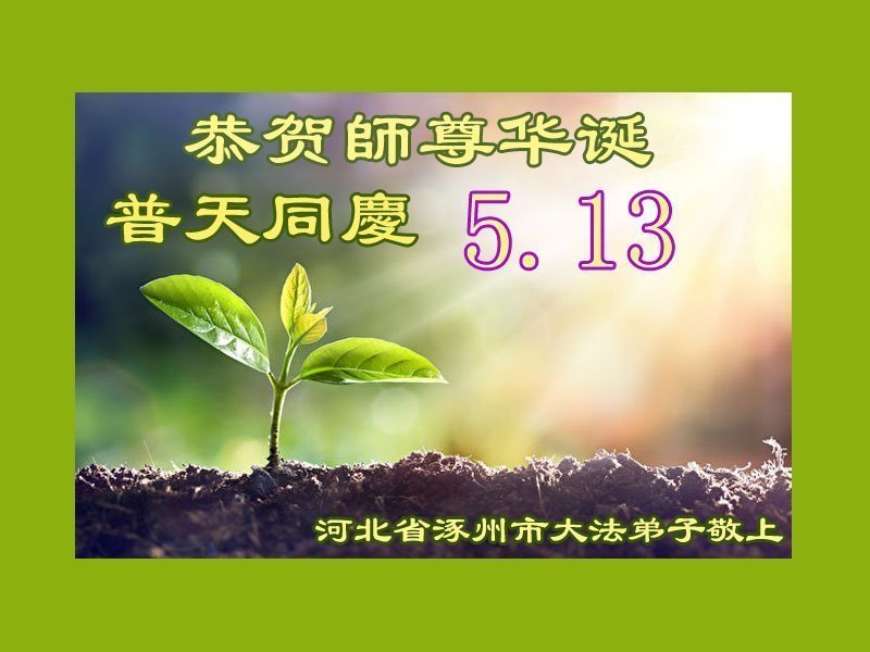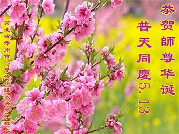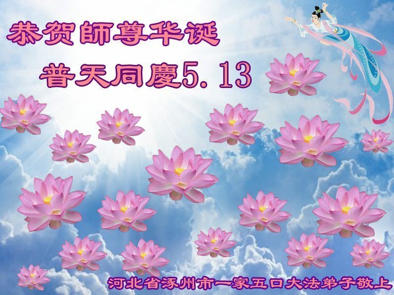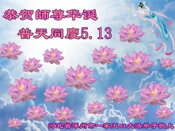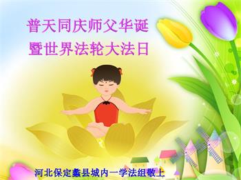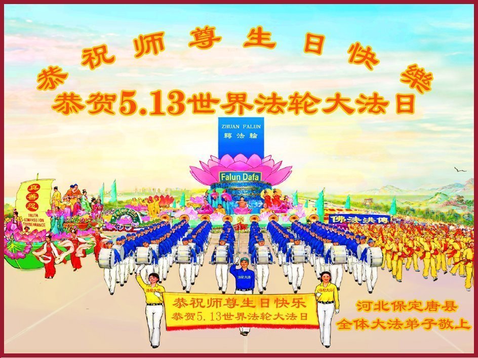 在這偉大而又輝煌的歷史時刻,我們唐縣所有的大法弟子幸遇師尊把我們救度。師父您辛苦了!我們一定不負大法弟子救度眾生的使命,精進實修,做好三件事,敬請師尊放心。