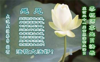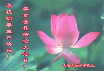 五月是最吉祥美麗的季節,看到海外各國大法弟子喜迎「聖日」,組織各種活動節目恭賀師尊華誕並慶祝「五一三世界法輪大法日」,感受那些活動場面非常壯觀殊勝,心裏無比的喜悅。值此聖日來臨之際,大法弟子淨蓮、藍星、清蓮、湘蓮感恩師尊的慈悲救度與保護,遙祝師尊生日快樂!