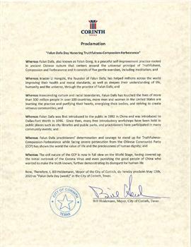 因此,現在,我,比爾﹒海德曼(Bill Heidemann),作為科林斯市市長,特此宣布二零二零年五月十三日為寇閏斯市「法輪大法日(周)」。
