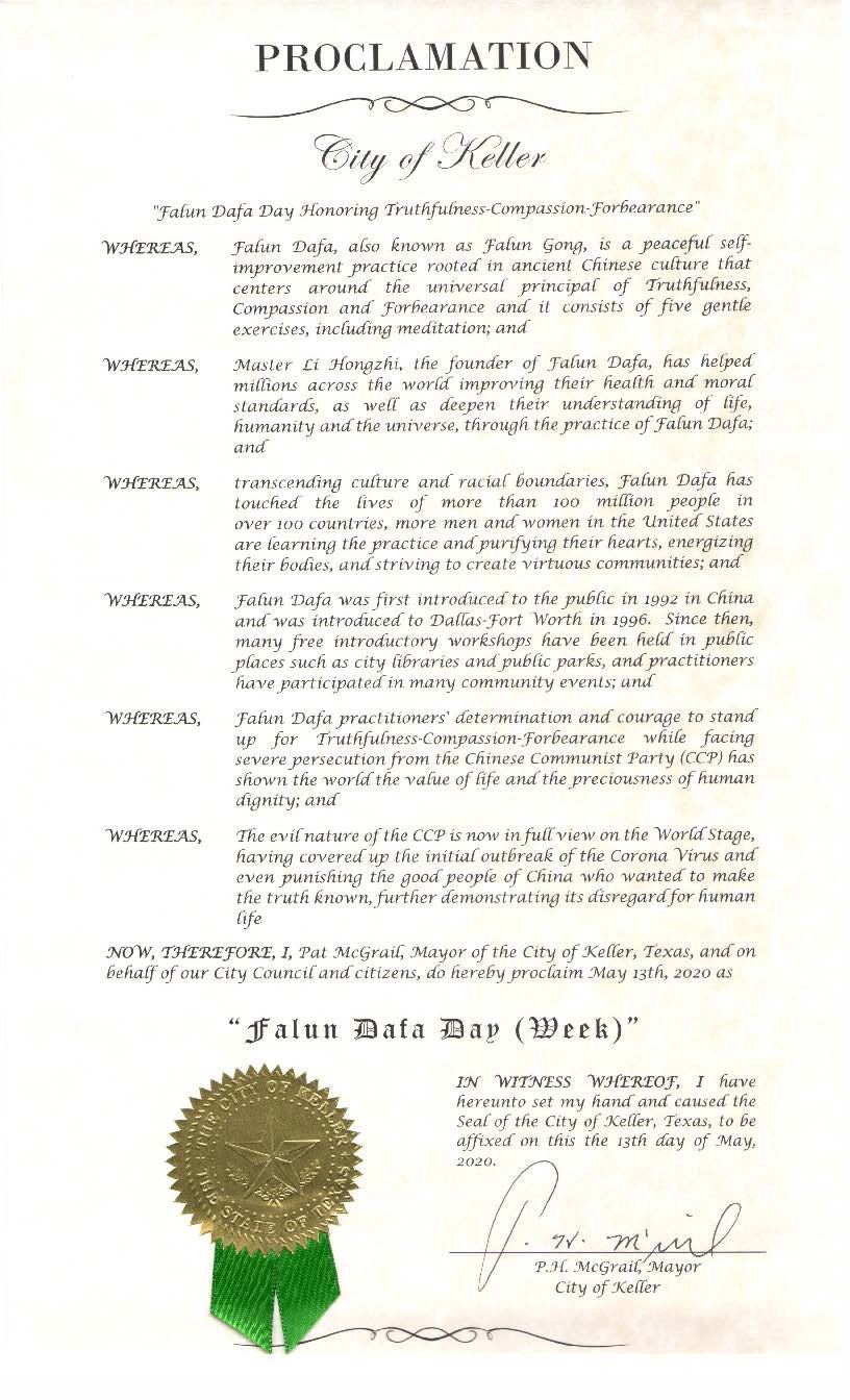 因此,現在,我,帕特﹒麥克貴爾(Pat McGrail),作為德克薩斯州凱勒市市長,代表市議會和市民,特此宣布二零二零年五月十三日為凱勒市「法輪大法日(周)」。