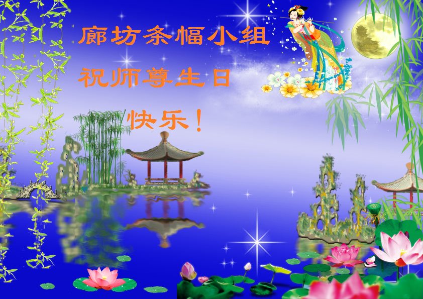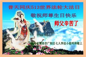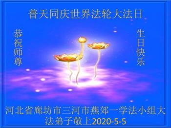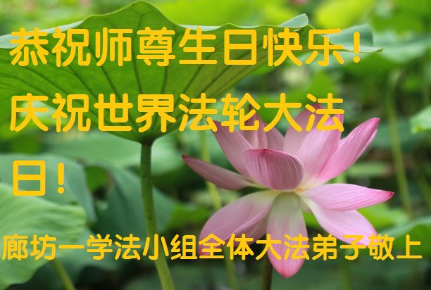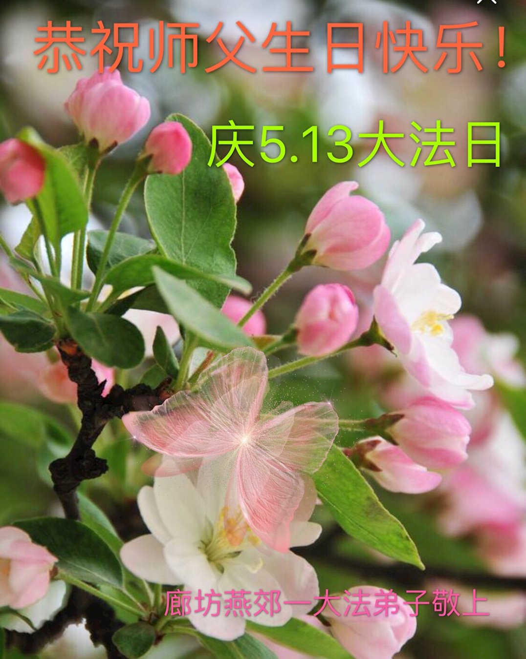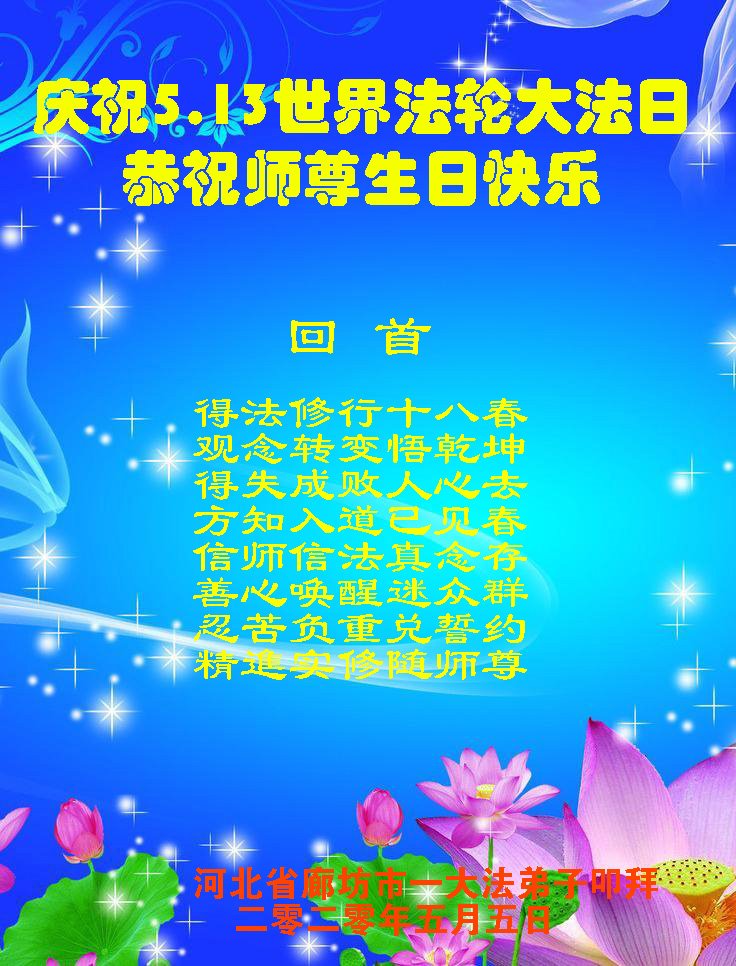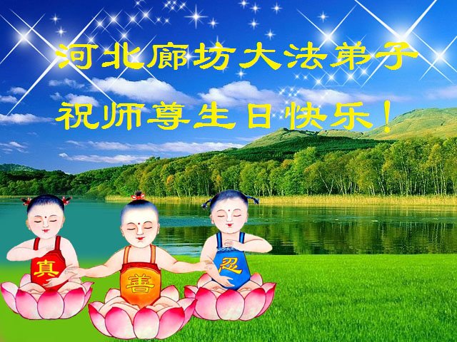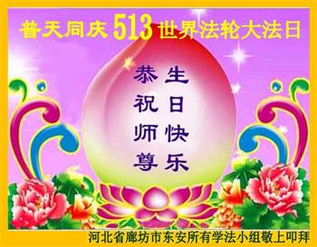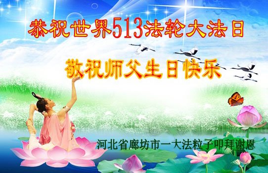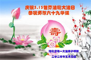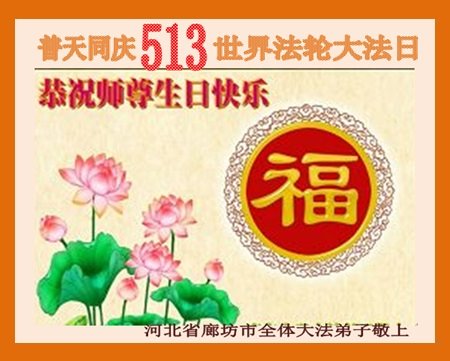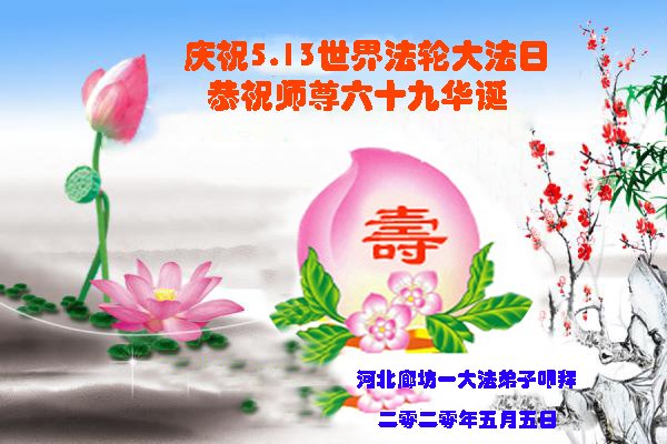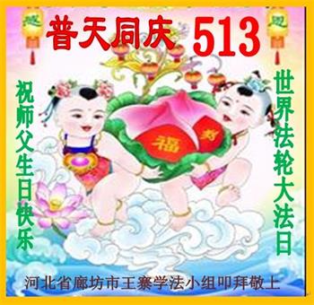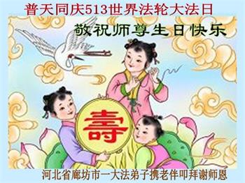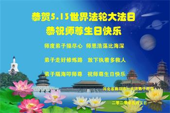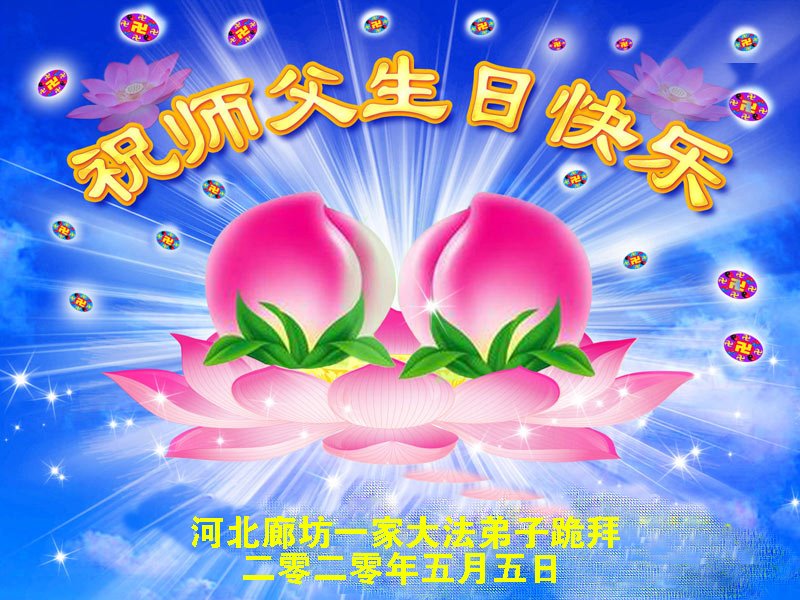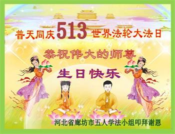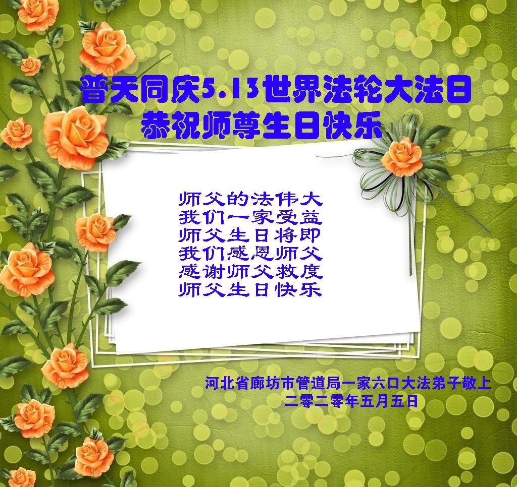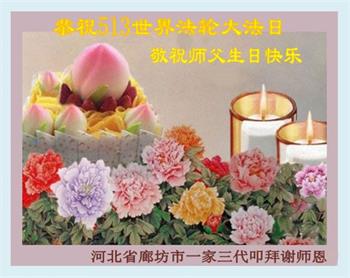 河北廊坊市全家五名大法弟子在五﹒一三即將到來之際恭賀世界法輪大法日!虔拜師尊恭祝生日快樂!