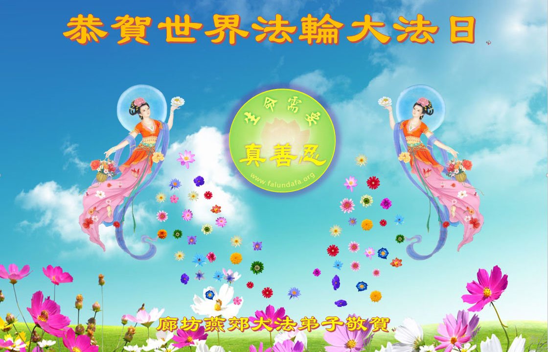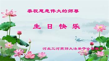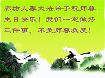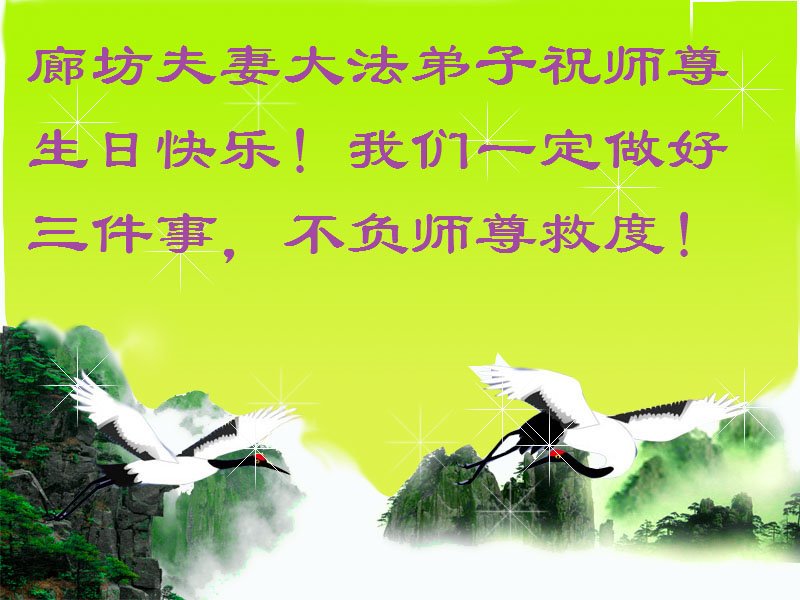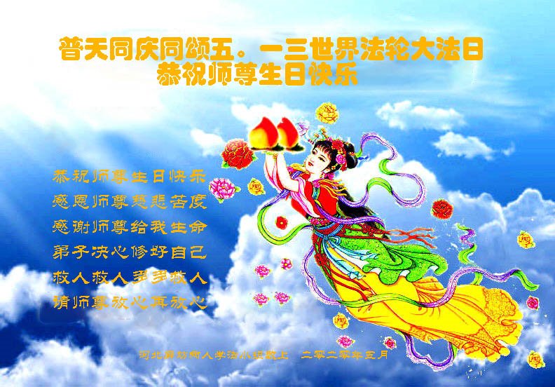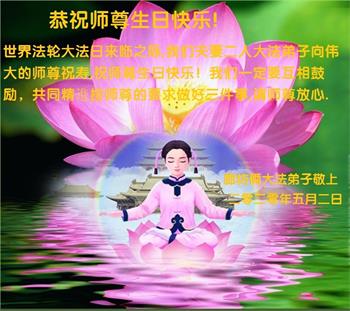 世界法輪大法日來臨之際,我們夫妻二人大法弟子向偉大的師尊祝壽,恭祝師尊生日快樂!我們一定要互相鼓勵,共同精進,按師尊的要求做好三件事,請師尊放心。