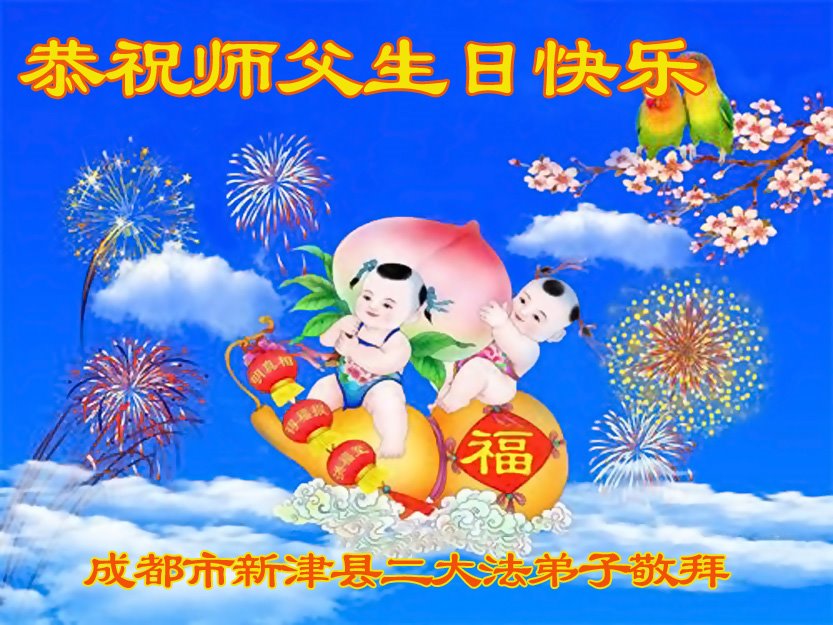 四川省成都市新津縣二名大法弟子恭祝慈悲偉大的師父生日快樂!