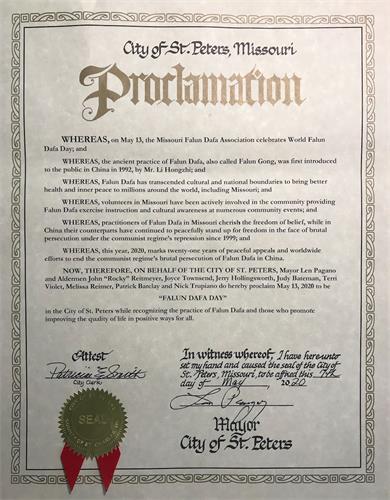 鑑此,市長藍﹒帕格諾,市議員約翰「洛奇」雷特邁耶、珠麗絲﹒湯森德、傑裏﹒霍林斯沃思、朱迪﹒貝特曼、特麗﹒維奧利特、瑪麗薩﹒瑞曼、帕特裏克﹒巴克萊、尼克﹒楚皮亞努,特此宣告二零二零年五月十三日為聖彼得市