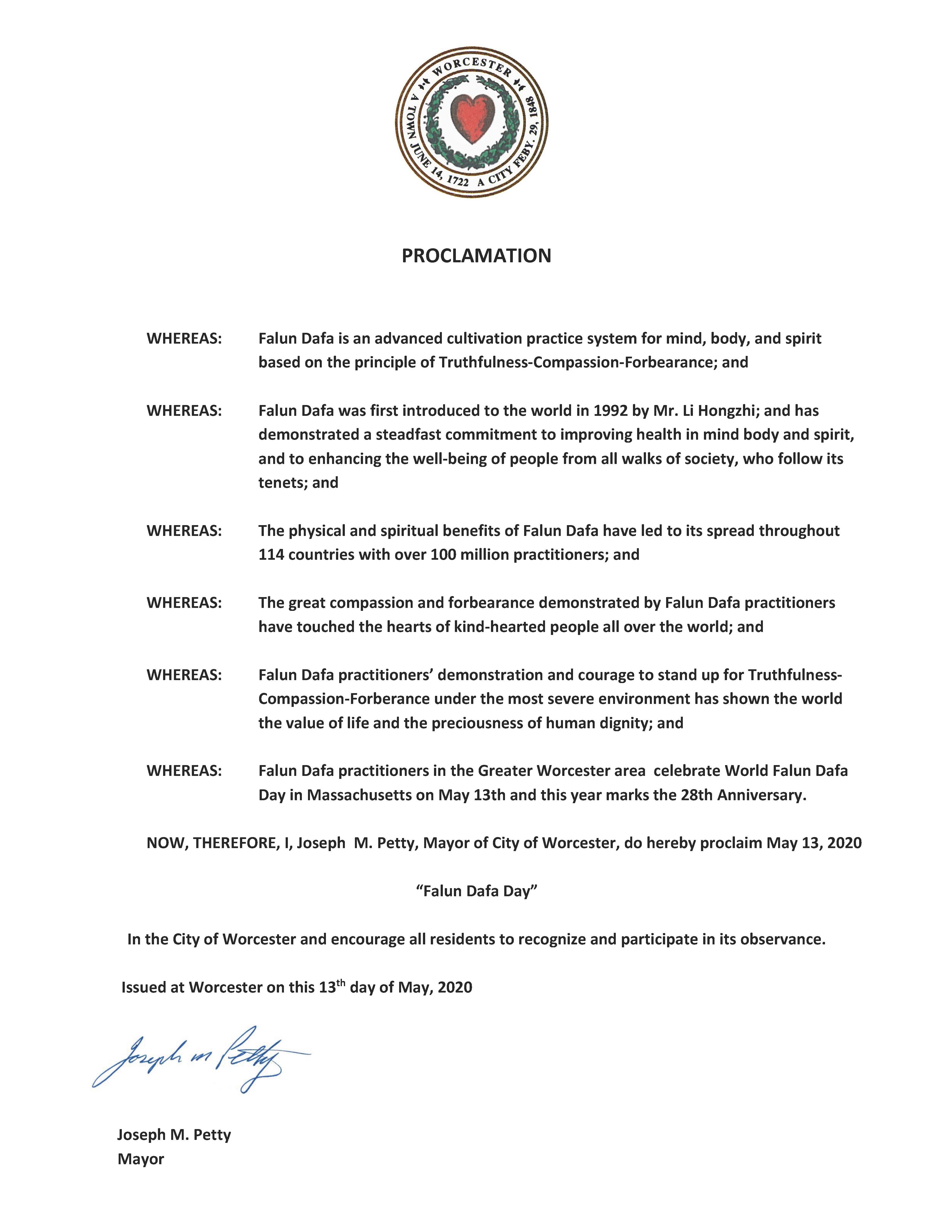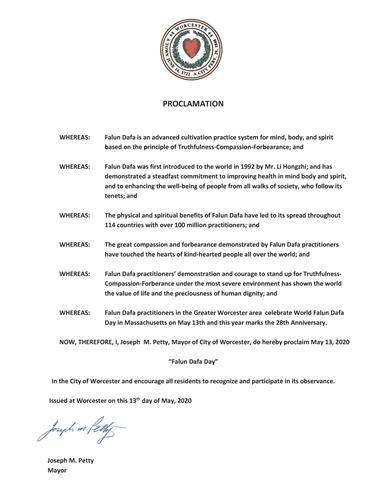 因此:我,佩提,渥斯特市市長,宣布2020年5月13日為「法輪大法日」,並鼓勵所有渥斯特市居民認可和參與這個慶祝。