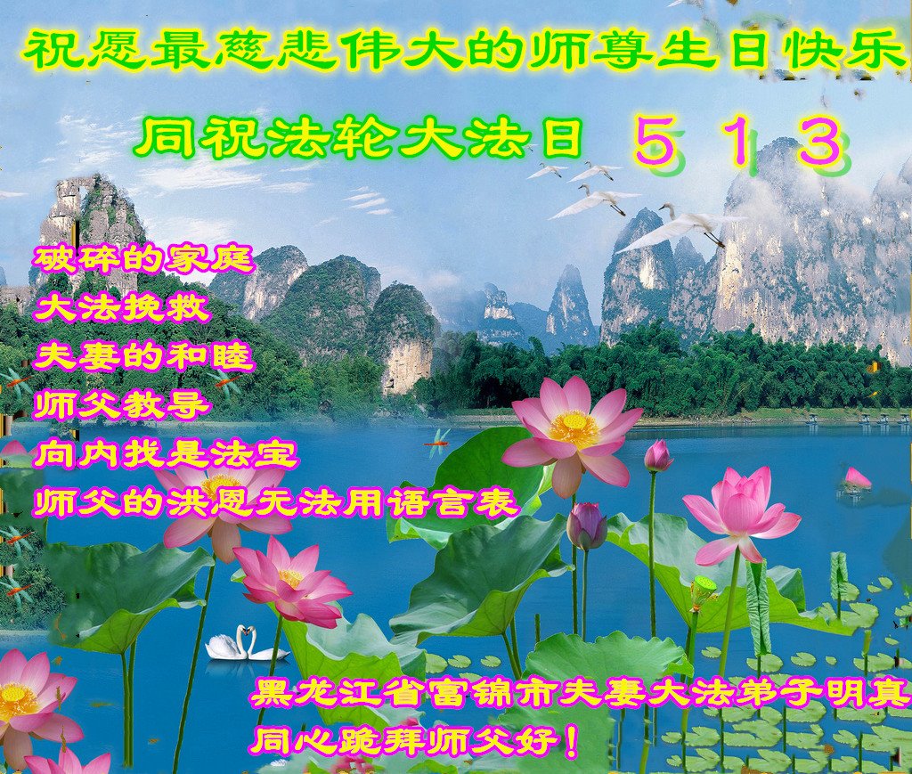 黑龍江省佳木斯市富錦市夫妻大法弟子恭祝師父生日快樂!同賀法輪大法日!