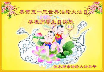 黑龍江佳木斯一老年大法弟子恭賀5.13世界法輪大法日!