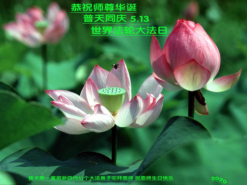 我們全家人向最慈悲偉大的師尊問好!師父辛苦了!跪地叩拜師父!五月十三日這個神聖的日子,師父把大法傳給眾生,使眾生獲得救度的希望,走入更加美好的未來。請師尊放心,弟子一定要努力精進,走好最後的路,和師父回家。合十