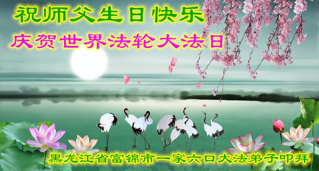 我們一家子孫三代六口大法弟子共同祝願最慈悲最偉大的師父生日快樂!祝賀法輪大法日!整體昇華,整體配合,整體提高,修去指責心、怨恨心、妒嫉心、爭鬥心;多寬容、多包容、多體涼、多理解別人,多看對方的閃光點,取長補短,珍惜家人的緣份,共同做好自己的角色,帶好小同修,用真善忍的標準要求自己,完成史前的誓約!