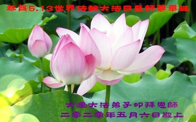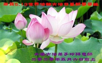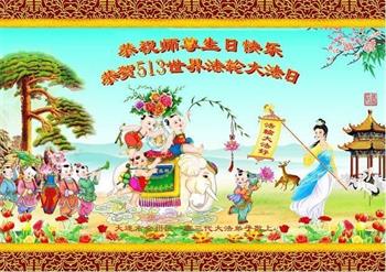 光陰如閃電,轉眼又一年,又到了大法弟子難忘的日子,五一三世界法輪大法日,同時又是慈悲偉大的師尊生日,恭祝師尊生日快樂!師尊您辛苦了!感謝師尊的慈悲救度!感謝師尊的一路保護!今後一定要聽師父的話,要多學法、學好法,做好三件事,救度末劫前沉淪的世人,真正的實修自己,才能不負師望,圓滿隨師還。