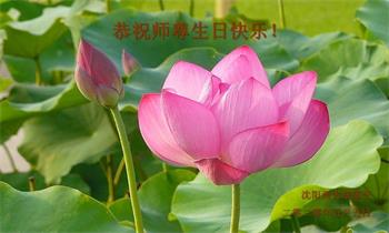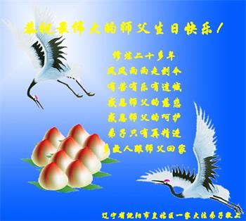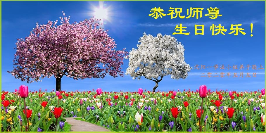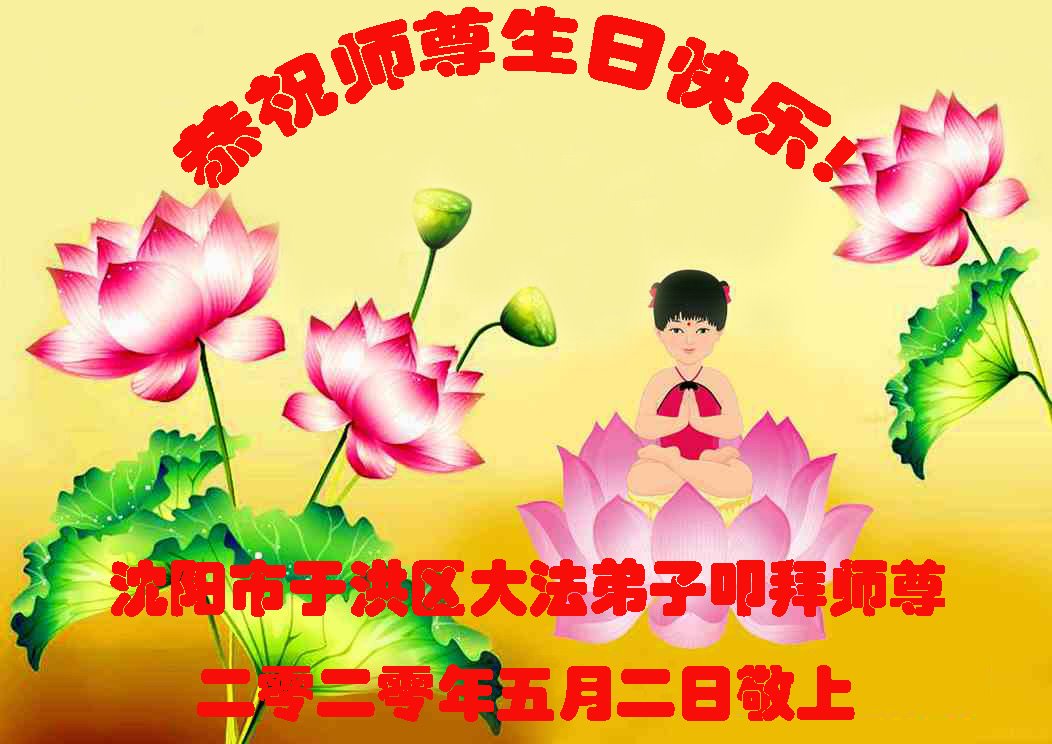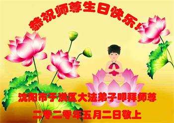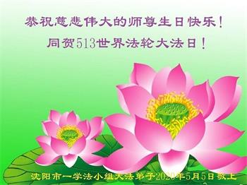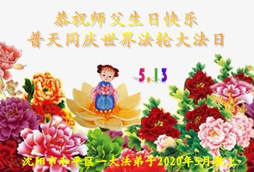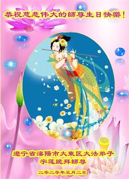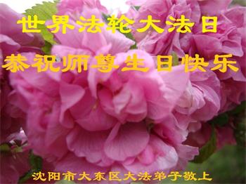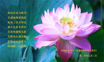 遼寧省瀋陽皇姑一大法弟子恭祝慈悲偉大的師尊生日快樂!同慶法輪大法洪傳二十八週年!