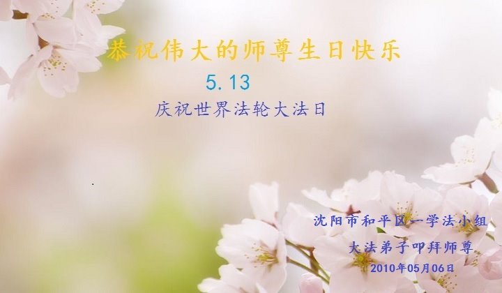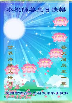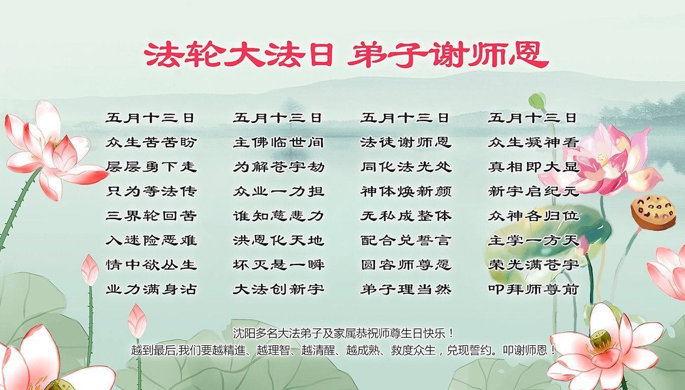 瀋陽多名大法弟子及家屬恭祝師尊生日快樂!越到最後,我們要越精進,越理智,越清醒,越成熟,救度眾生,兌現誓約。