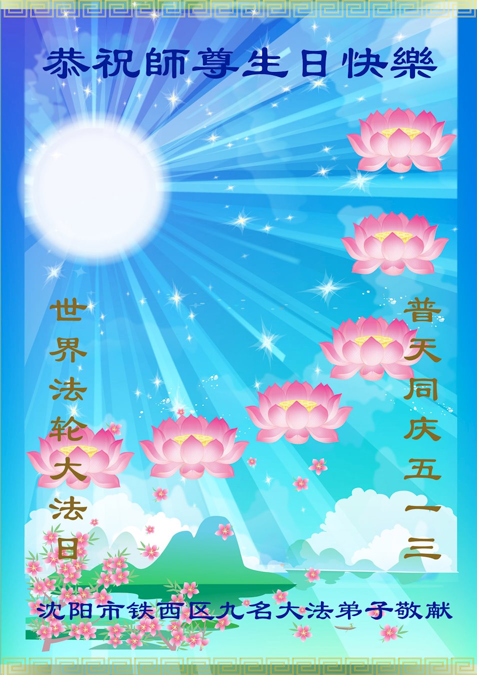 在二零二零年「5﹒13」這個全世界普天同慶、同頌萬眾歡歌喜慶的日子即將來臨之際,瀋陽大法弟子恭祝慈悲偉大的師尊生日快樂暨慶祝第二十一屆世界法輪大法日!