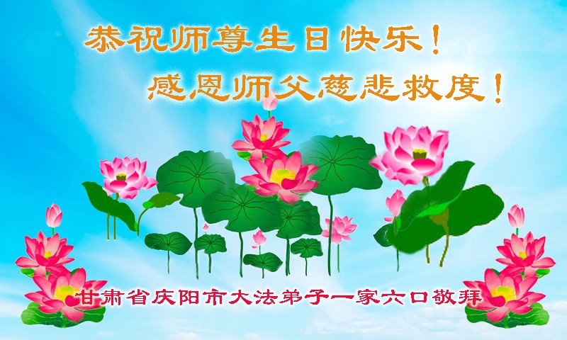 甘肅省天水市一大法弟子和家人恭祝慈悲偉大的師父生日快樂!