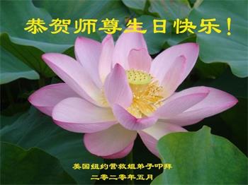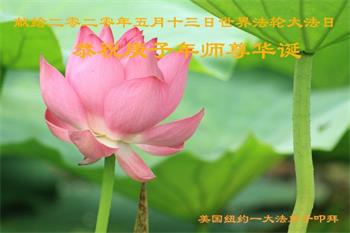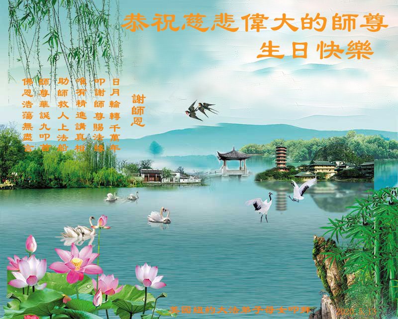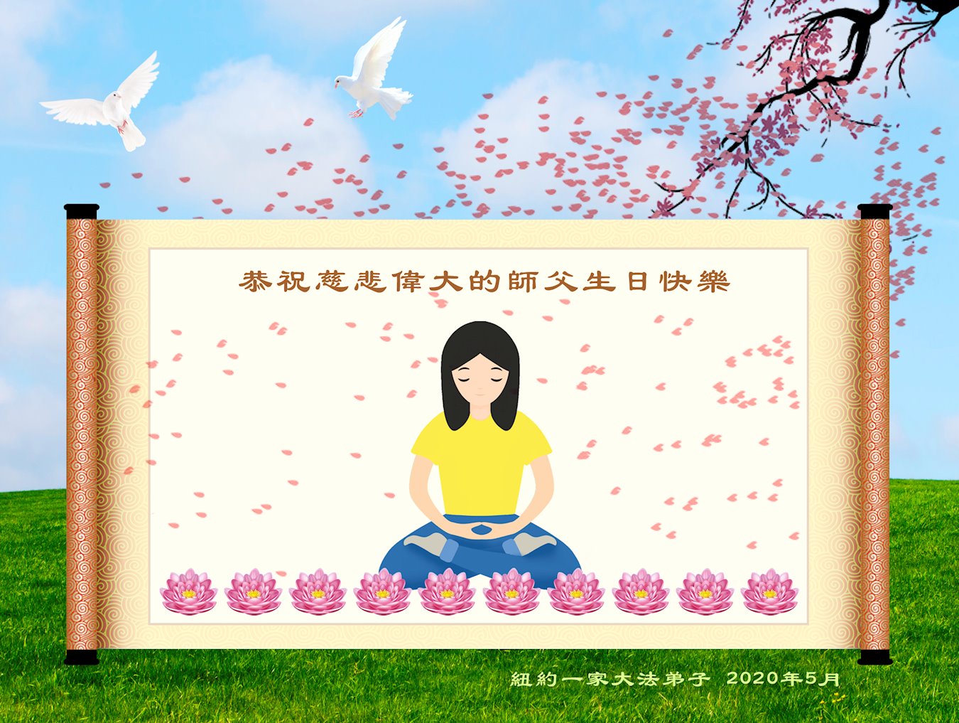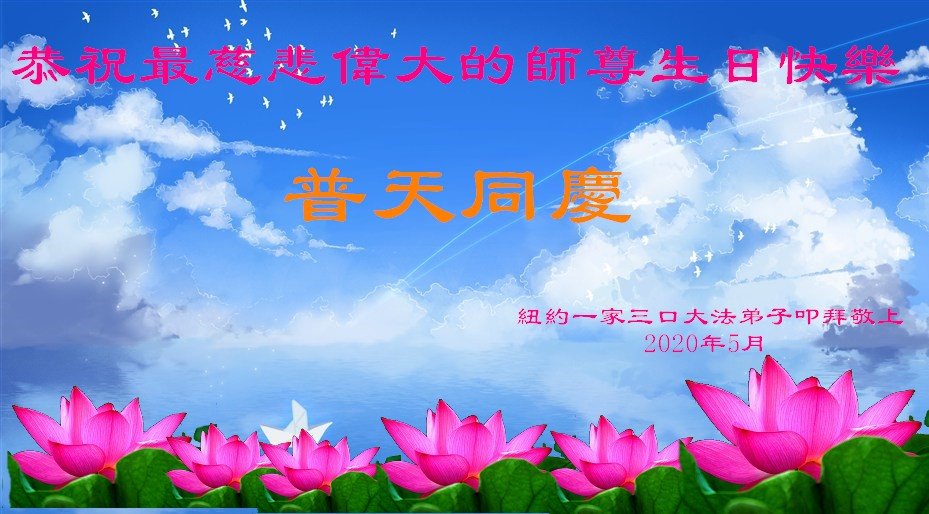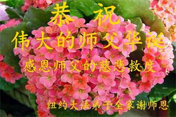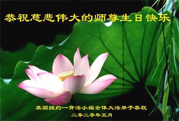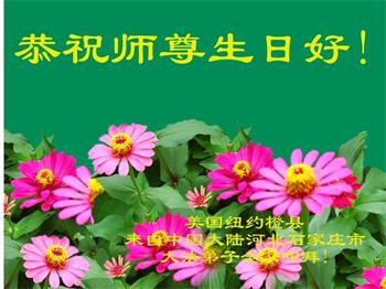浙江住紐約的大法弟子代表一家六口恭祝慈悲偉大的師尊生日快樂!同時也借此機會感恩師尊的慈悲救度!感恩師尊讓我有幸修大法身心都得到了健康,感恩師尊在我遭遇一場大車禍後身體迅速恢復健康,並且沒有留下任何後遺症,感恩師尊給予我第二次生命!師尊給予我們全家的一切用盡人間的語言也無法表達對師尊的感謝與感恩!唯有聽師尊的話,以真、善、忍為準則做一個真正的好人,做好大法弟子該做的三件事。絕不辜負師尊的慈悲救度!