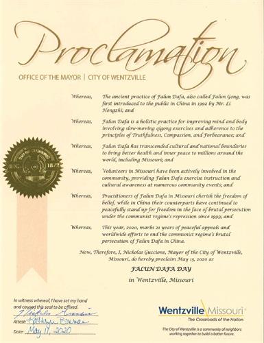 現在,鑑此,我,尼古拉斯﹒古奇昂,溫茨維爾市市長,宣布二零二零年五月十三日為密蘇裏州奧法隆市的法輪大法日。