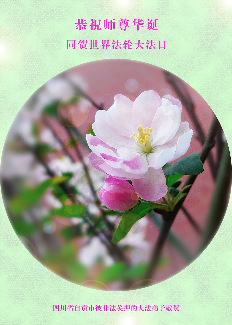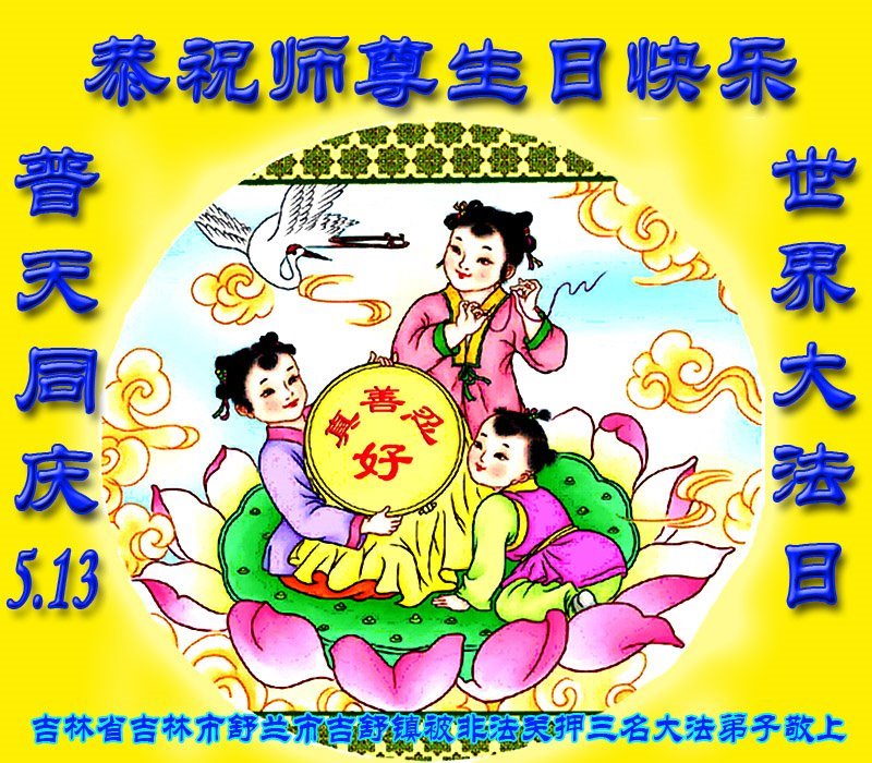 四川省自貢市被非法關押的大法弟子恭祝師尊華誕!普天同慶五﹒一三世界法輪大法日!謝謝師尊慈悲救度!無論在哪裏我們都是您的弟子,都在證實大法,都在做著自己該做的事!在普天同慶最美好的時日,弟子恭祝慈悲偉大的師尊生日快樂!