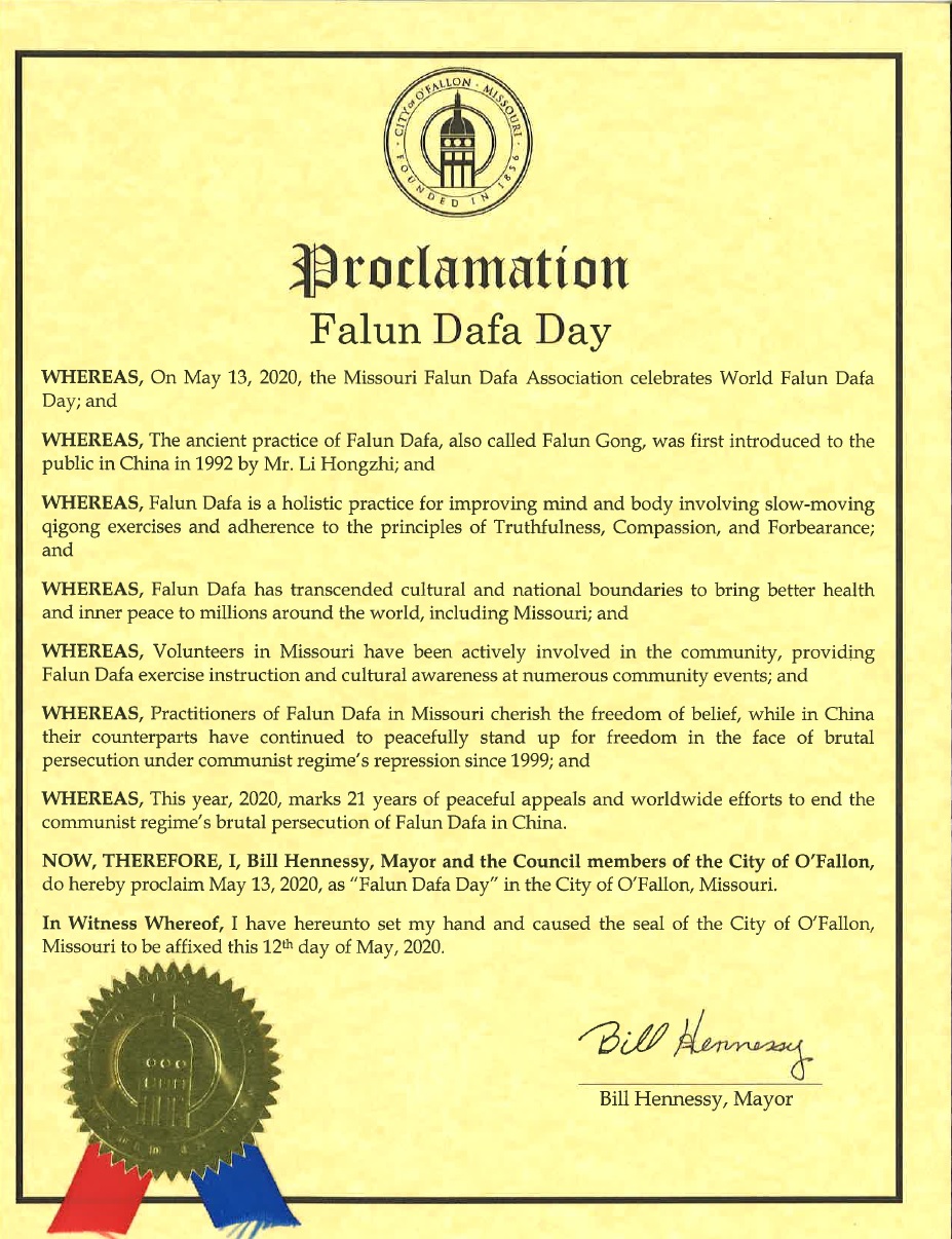 現在,鑑此,我,比爾﹒漢尼斯,奧法隆市市長和市議會,宣布二零二零年五月十三日為密蘇裏州奧法隆市的法輪大法日。
