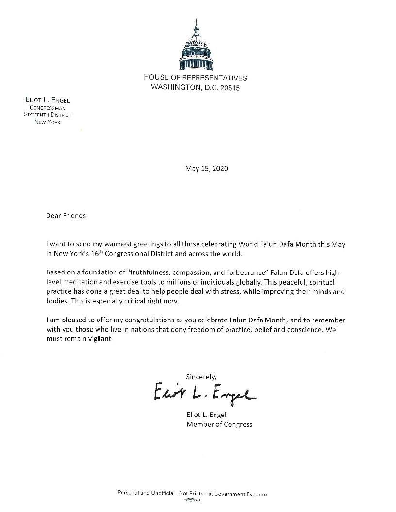 紐約國會議員艾略特﹒恩格爾(Eliot L. Engel)是美國眾議院外交委員會主席。他在給紐約法輪功學員的賀信中說:「向今年五月在紐約第十六社區和全世界慶祝世界法輪大法月的人們致以最熱烈的問候。法輪大法以「真、善、忍」為原則,為全球數百萬人提供了高水平的打坐和鍛煉方法。這種和平、精神的實踐幫助人們應對壓力的同時,積極的改善他們的思想和身體,非常有實效。這一點現在尤其重要。我很高興在你們慶祝法輪大法月時表示祝賀,並同你們一起關注那些生活在被剝奪修煉、信仰和良心自由的國家的人們。對此,我們必須保持警惕。」