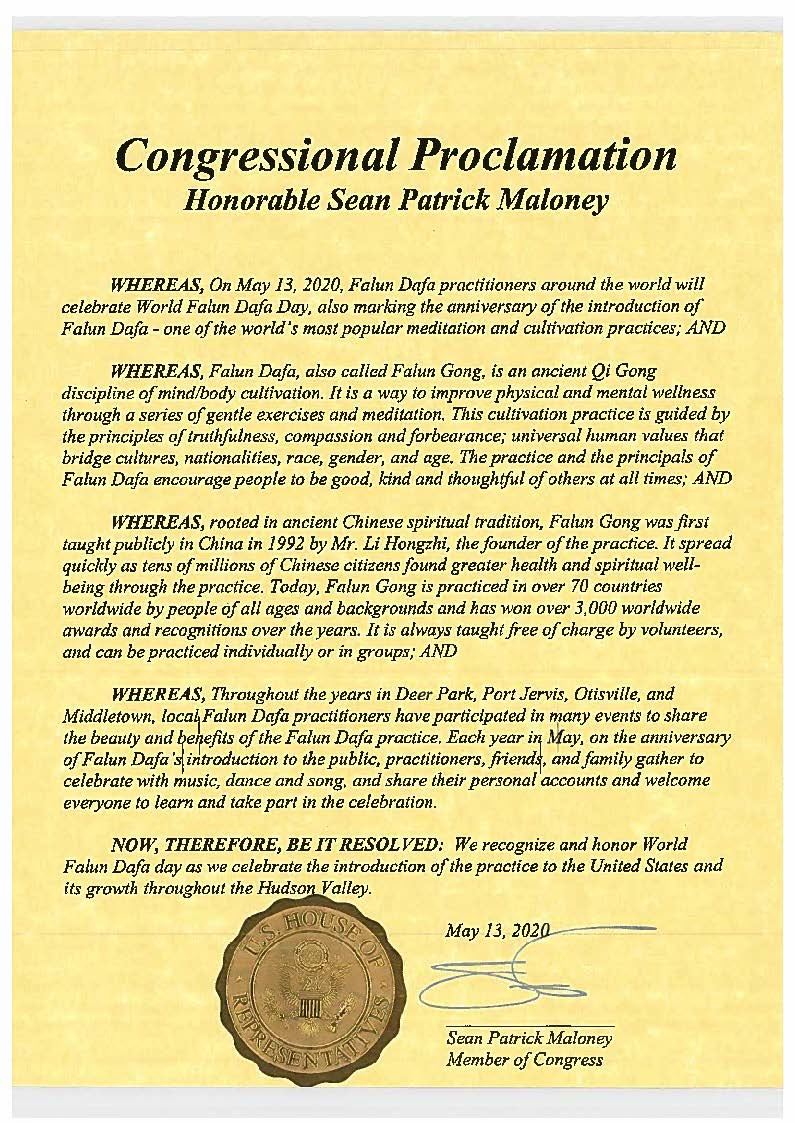 紐約第十八選區國會議員馬洛尼(Sean P. Maloney)發來褒獎 祝賀法輪大法日