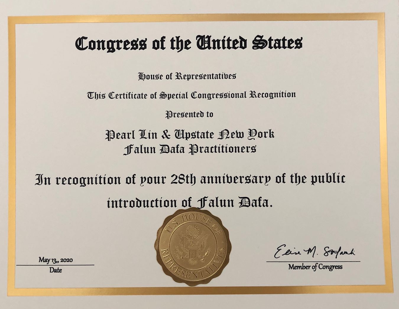 ![]() 圖4:紐約第二十一選區國會議員伊莉絲﹒斯特凡尼克(Elise M. Stefanik)發布特別認可證書表彰法輪大法洪傳世界二十八週年。 |