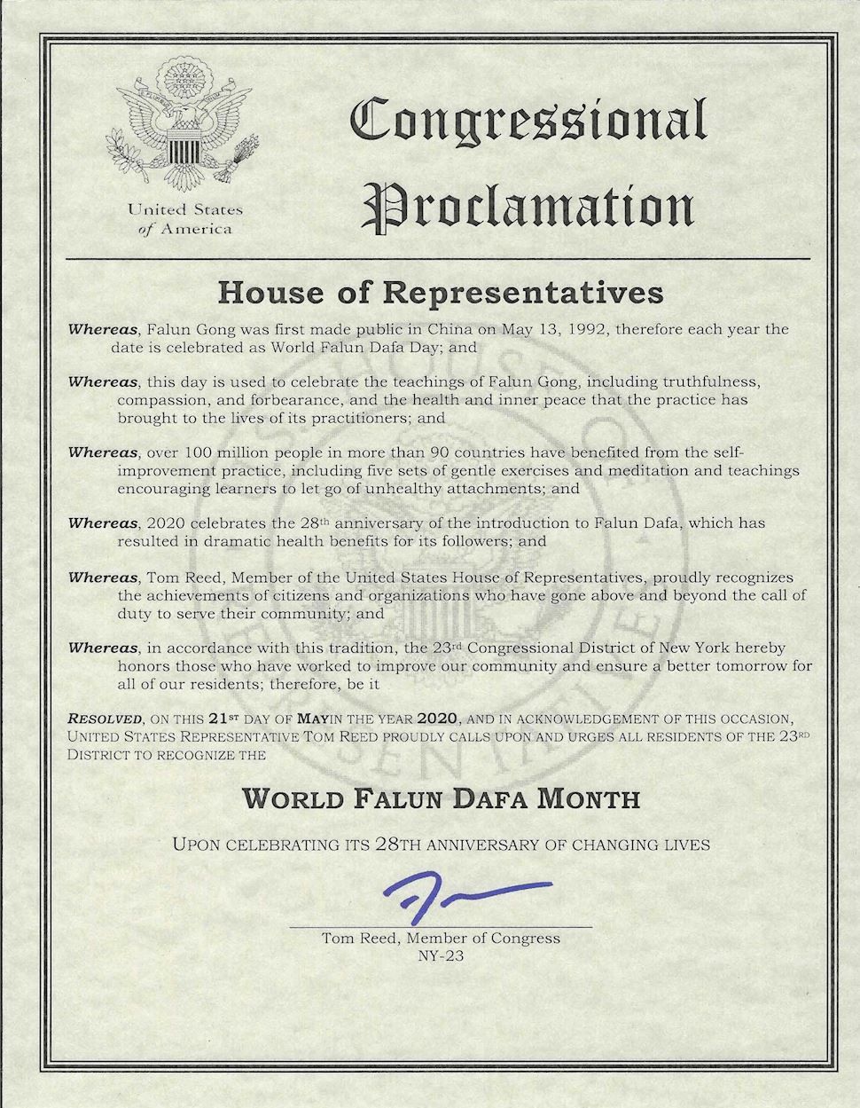 在此,二零二零年五月二十一日,美國眾議院議員湯姆﹒瑞德呼籲社區所有的民眾認同「世界法輪大法月」,慶祝法輪大法弘傳二十八年來給民眾帶來的可喜變化。