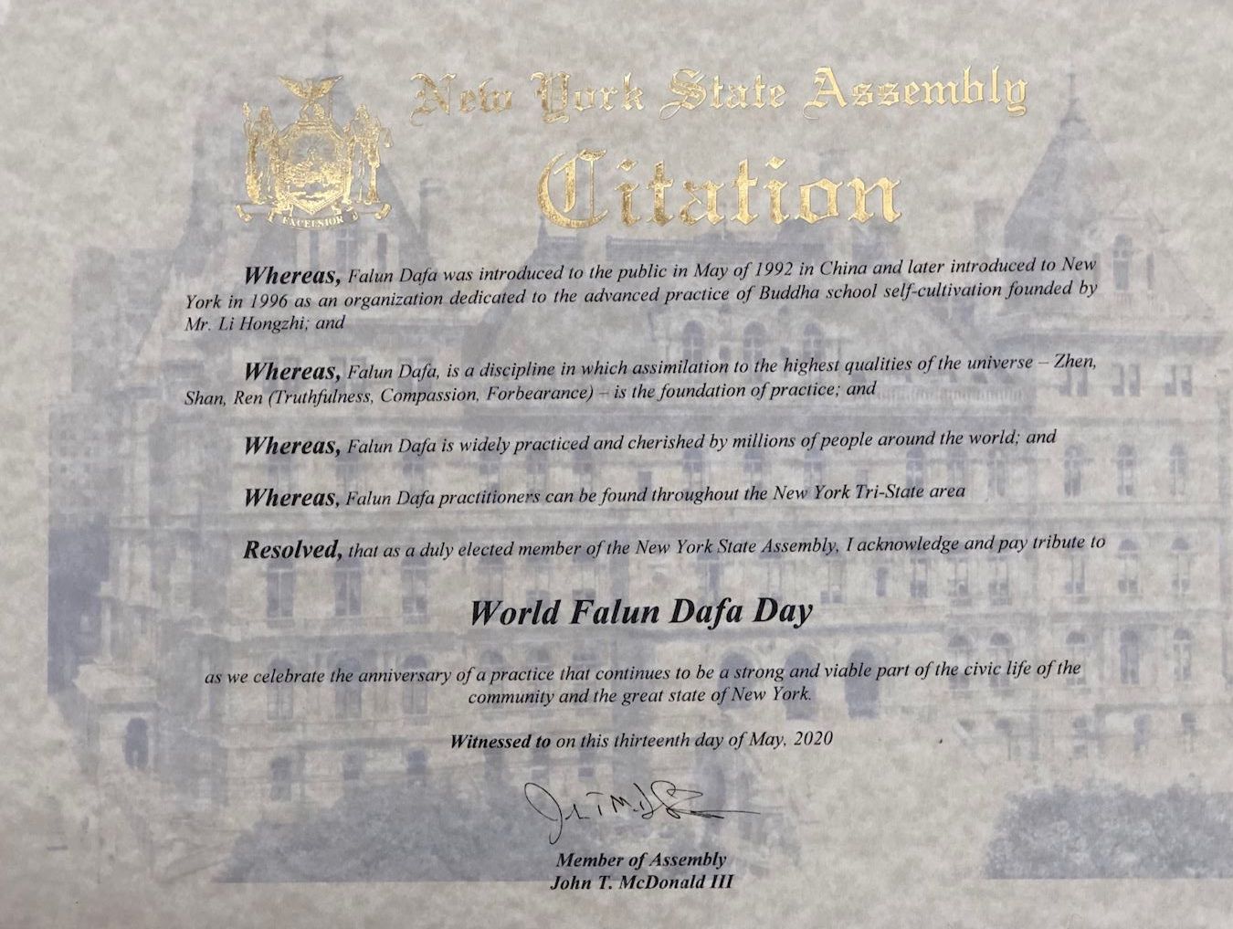 ![]() 圖8:紐約第一百零八選區州眾議員約翰﹒麥克唐納三世(John T. McDonald III)褒獎法輪大法日。 |