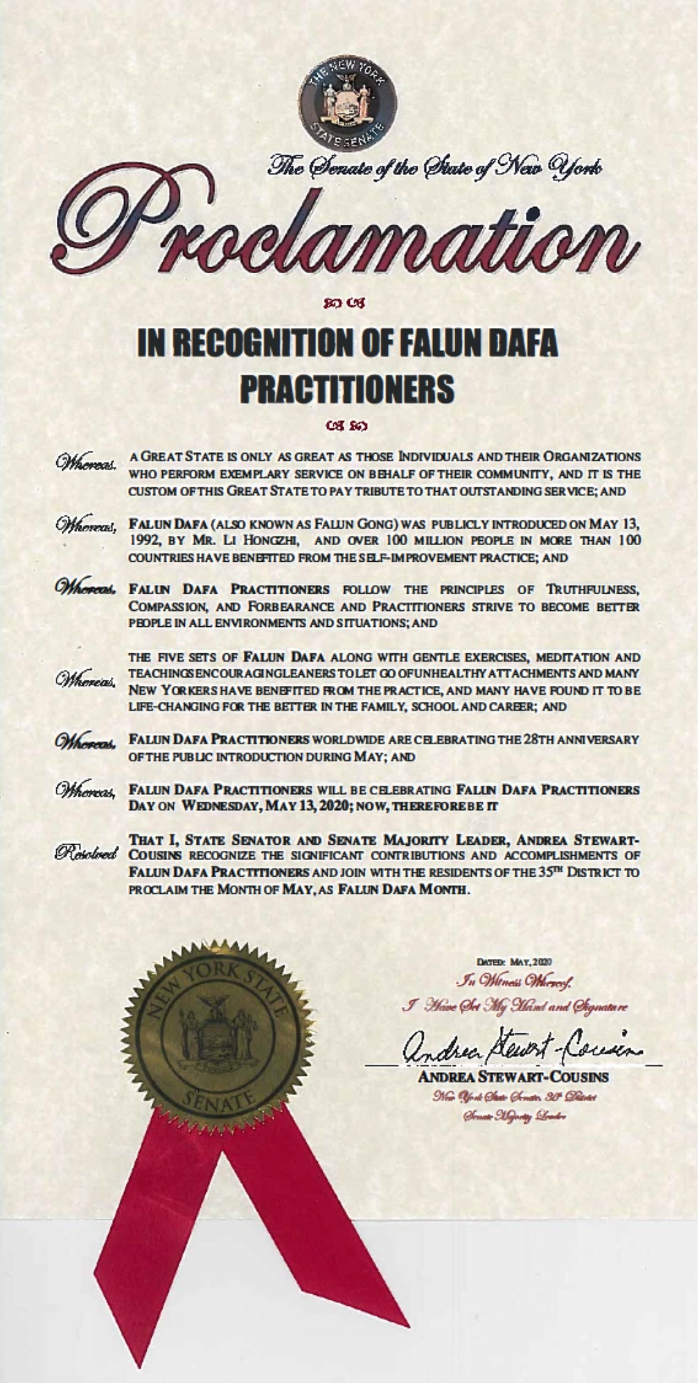 特此,我,安德萊亞﹒斯圖爾特-卡曾斯(Andrea Stewart-Cousins),作為紐約州參議員和參議院多數黨領袖,肯定法輪大法修煉者的重大貢獻和成就,特此與第三十五選區的居民一起褒獎五月為法輪大法月。