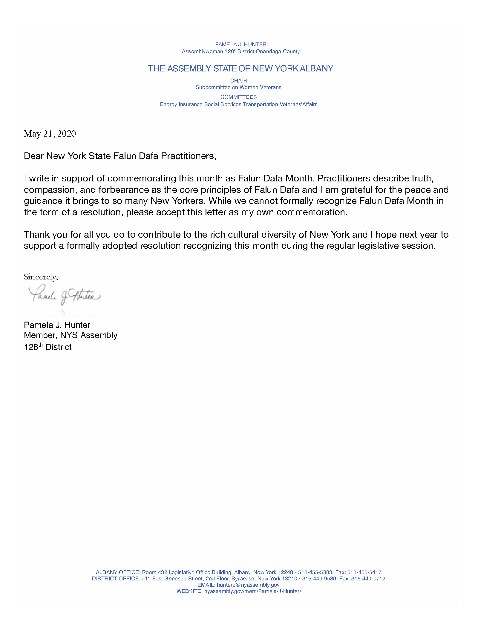 州眾議員亨特(Pamela J. Hunter)在信中祝賀五月為「法輪大法月」。亨特表示真善忍是法輪大法的核心原則,感謝法輪大法給許多紐約人帶來的平和與指導。並說紐約州議會今年無法以正式決議的形式褒獎法輪大法月,請接受這封信作為她個人的祝賀。
