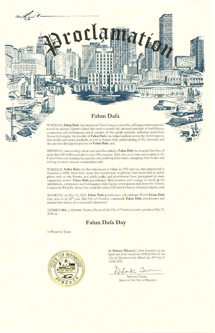 因此,我,西爾威斯特﹒杜南(Sylvester Turner),作為休士頓市長,特此宣布二零二零年五月十三日,為「法輪大法日」 。