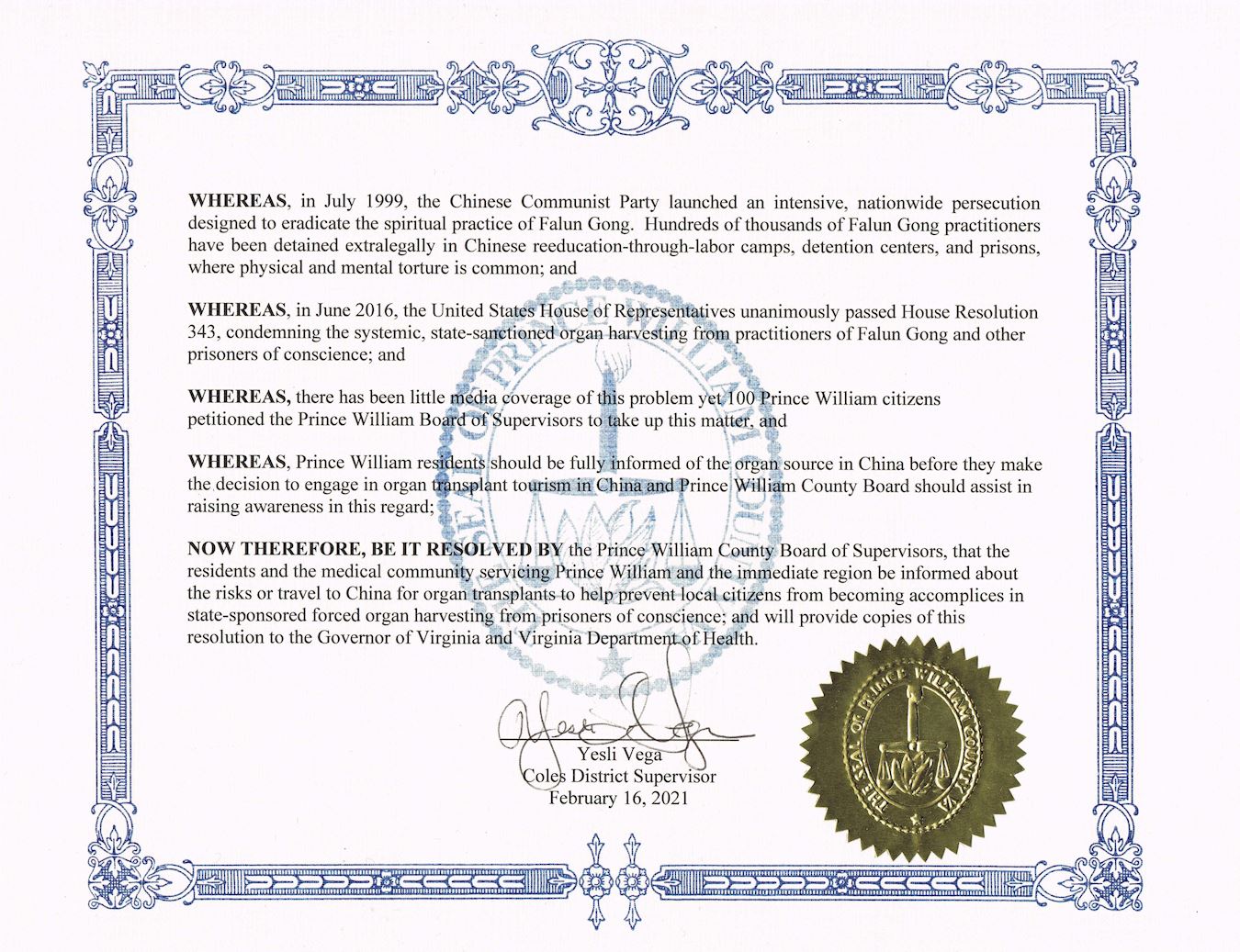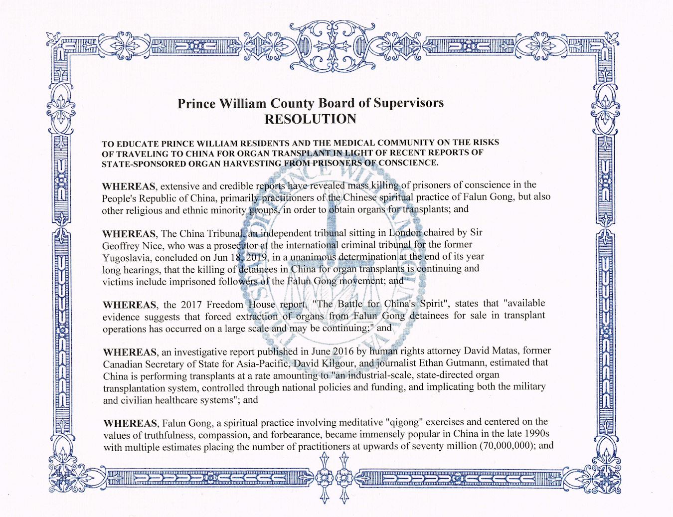 因此,現在由威廉王子縣委員會決議,通知威廉王子縣的居民和服務威廉王子縣以及附近地區的醫療界有關前往中國進行器官移植的風險,以幫助制止居住在當地的公民無意間成為(中共)國家認可的活摘良心犯器官行徑的共謀;並向弗吉尼亞州州長和弗吉尼亞州衛生署提供該決議案的副本。