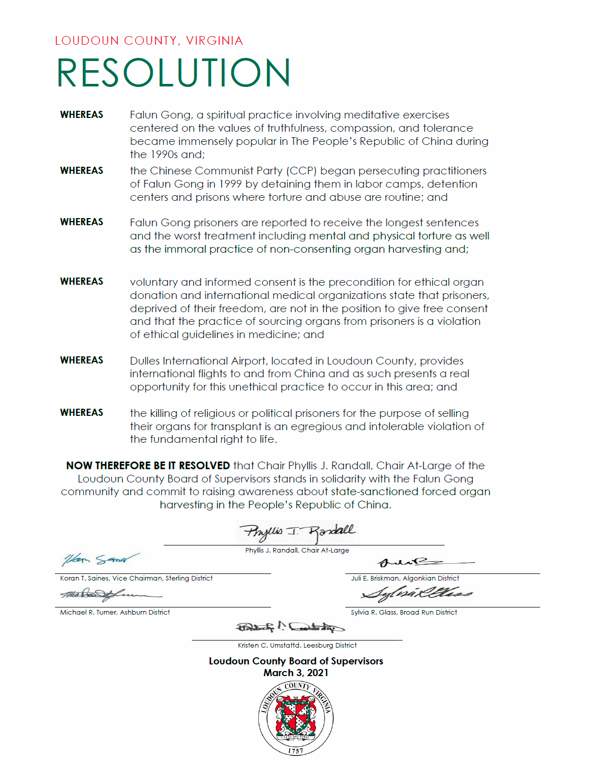 現決議,勞登縣委員會主席菲利斯﹒J﹒蘭德爾(Phyllis J. Randall)(以及以下決議案簽署人)聲援法輪功團體,並致力於提高人們對中國(中共)政府批准推行活摘器官(罪行)的認識。