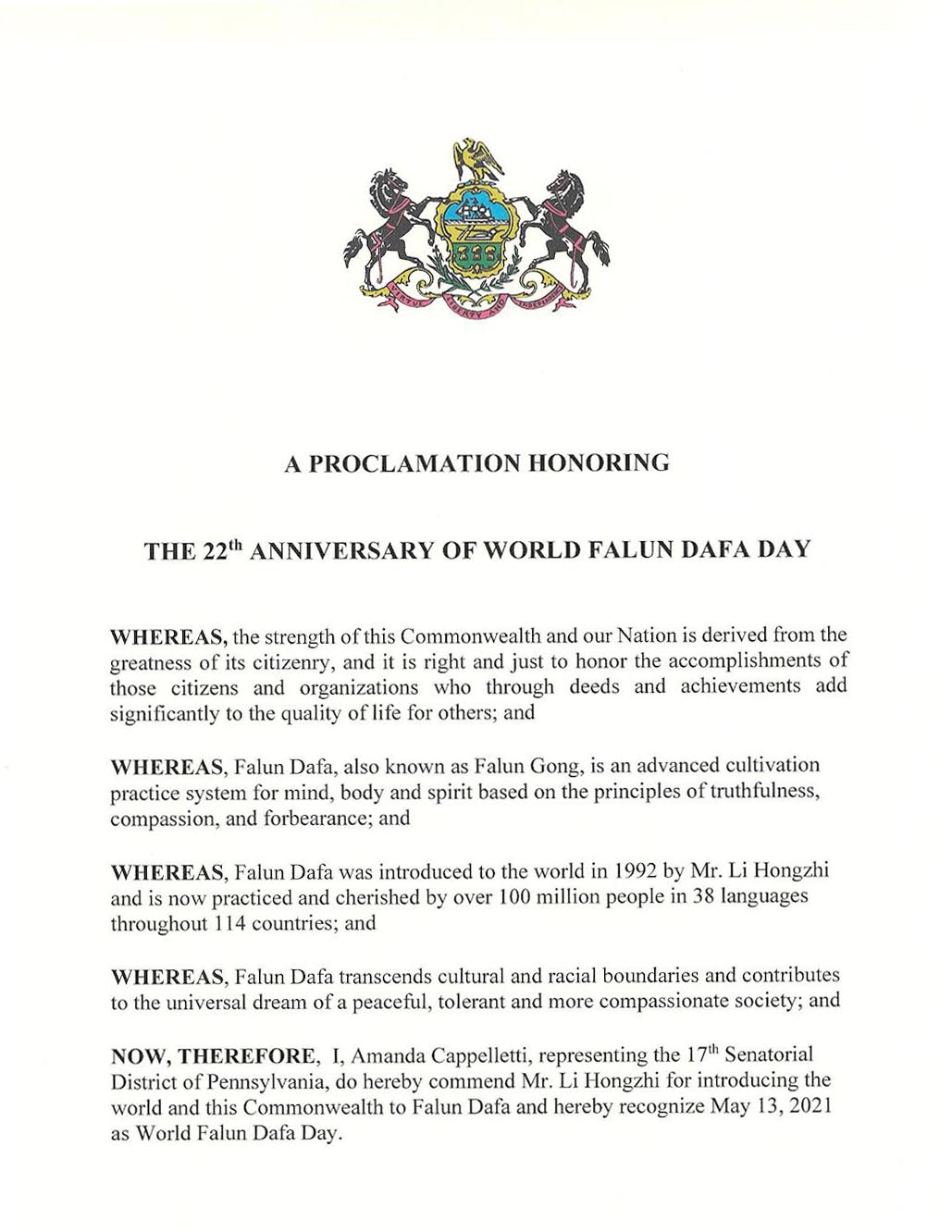 鑑此,我,阿曼達﹒卡佩萊蒂(Amanda Cappelletti),謹代表賓州第17參議院選區,在此表彰李洪志先生向世界和本社區介紹法輪大法,並特此宣布2021年5月13日為我們選區的世界法輪大法日。