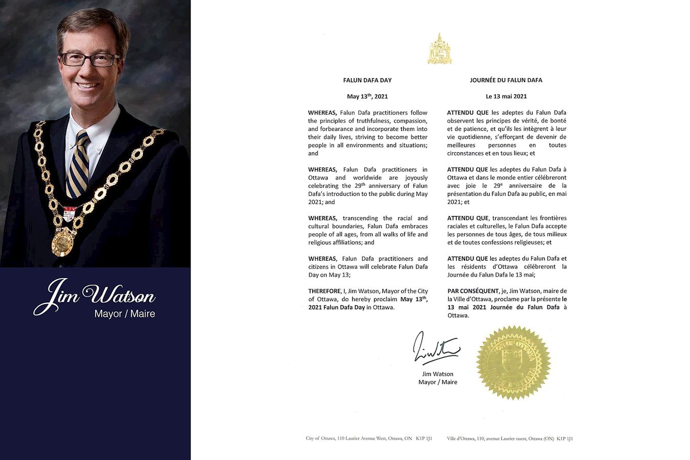「因此,我,吉姆﹒沃森,渥太華的市長,宣布2021年5月13日為『渥太華法輪大法日』。」