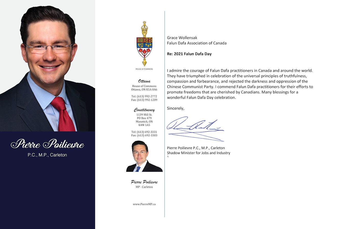 前保守黨聯邦部長、保守黨影子內閣工作及工業部長、渥太華選區國會議員鮑利夫(Pierre Poilievre)在賀信中寫道:「我欽佩加拿大和世界各地的法輪功學員的勇氣。他們在洪揚真善忍普世價值方面大功告成,同時摒棄了中共的黑暗,抵制了中共的迫害。「
