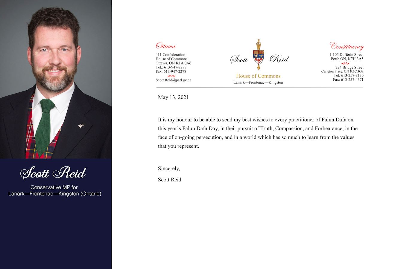 國會議員瑞德(Scott Reid)在賀信中說:面對持續的迫害,法輪功學員們始終不懈追求真、善、忍。在今年的「法輪大法日」,能夠向每一位法輪大法弟子致以最良好的祝願,是我的榮幸。在一個充滿挑戰的世界中,人們可以從法輪大法代表的價值觀中學到很多。