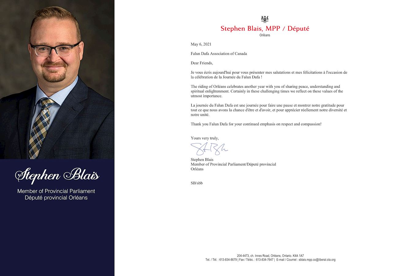 渥太華選區安省議員斯蒂芬﹒布萊斯(Stephen Blais)發出賀信:「奧爾良(Orléans)選區與你們再次共同慶祝(法輪大法日),分享平和、理解以及精神啟迪。毫無疑問,在目前充滿挑戰的時刻,我們更要反思這些尤為重要的價值觀。」「感謝法輪大法一直以來提倡尊重和善良。」