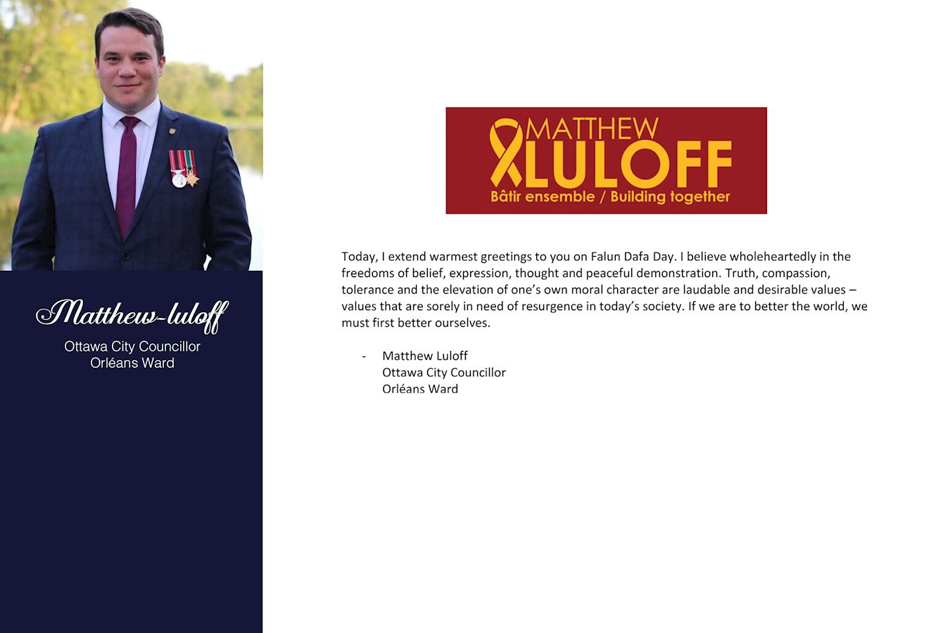 渥太華市議員馬修﹒洛洛夫(Matthew Luloff)在賀信中說:「今天,在法輪大法日,我向您致以最熱烈的問候。我完全相信信仰、表達、思想和和平示威的自由。真、善、忍和個人道德的提高是值得稱讚和可取的價值觀,這些價值觀在當今社會非常需要復興。如果我們要改善世界,就必須首先改善自己。」