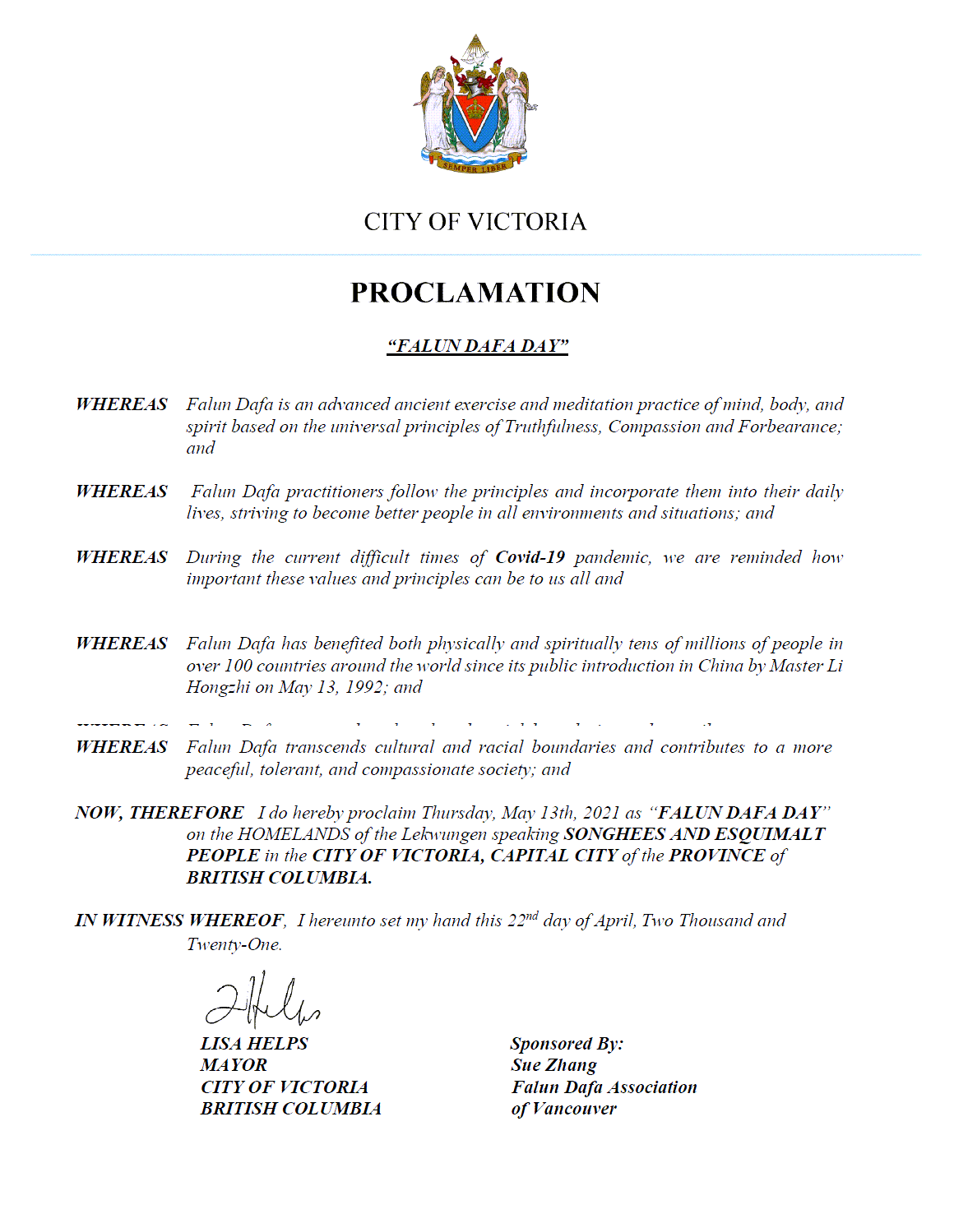 我,麗莎﹒郝爾普斯,維多利亞市市長,特此宣布,二零二一年五月十三日,星期四,為加拿大卑詩省省府維多利亞市(桑吉斯人和埃斯基馬爾特人的家園)「法輪大法日」。