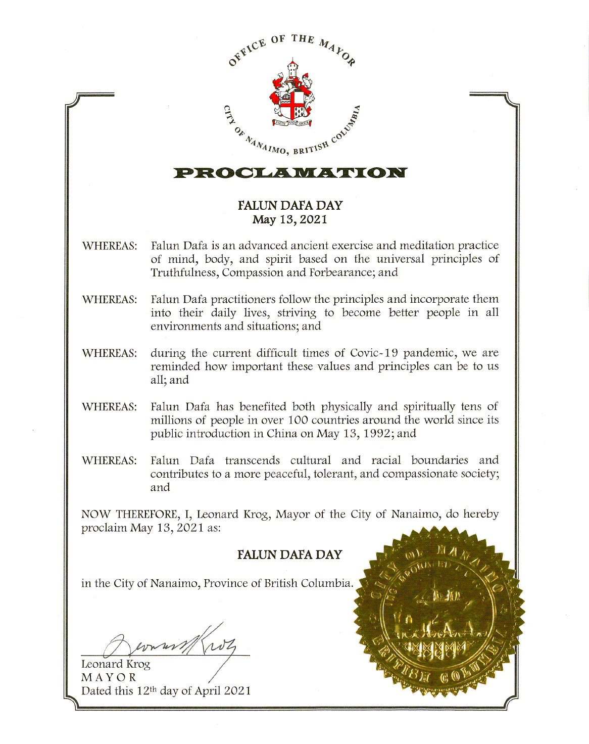 鑑此,我,納奈莫市市長倫納德﹒克羅格(Leonard Krog),特此宣布二零二一年五月十三日為加拿大卑詩省納奈莫市「法輪大法日」。