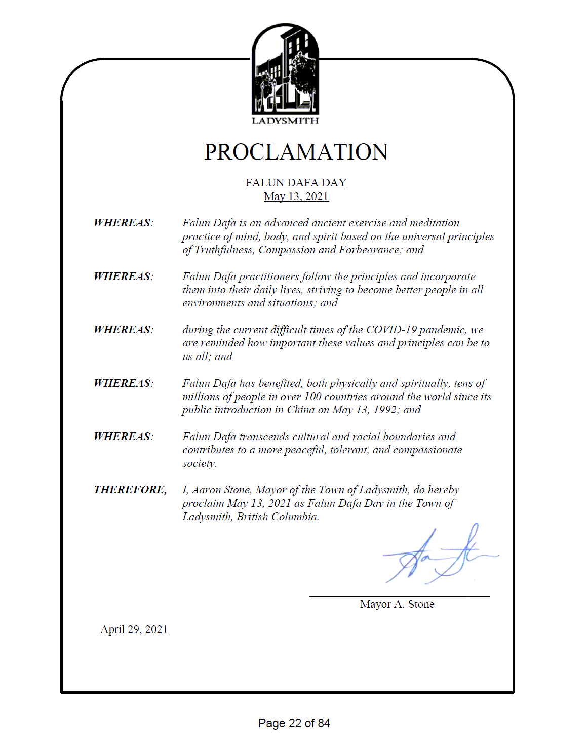 我,萊迪史密斯市市長艾倫﹒斯通,特此宣布,二零二一年五月十三日為卑詩省萊迪史密斯市「法輪大法日」。